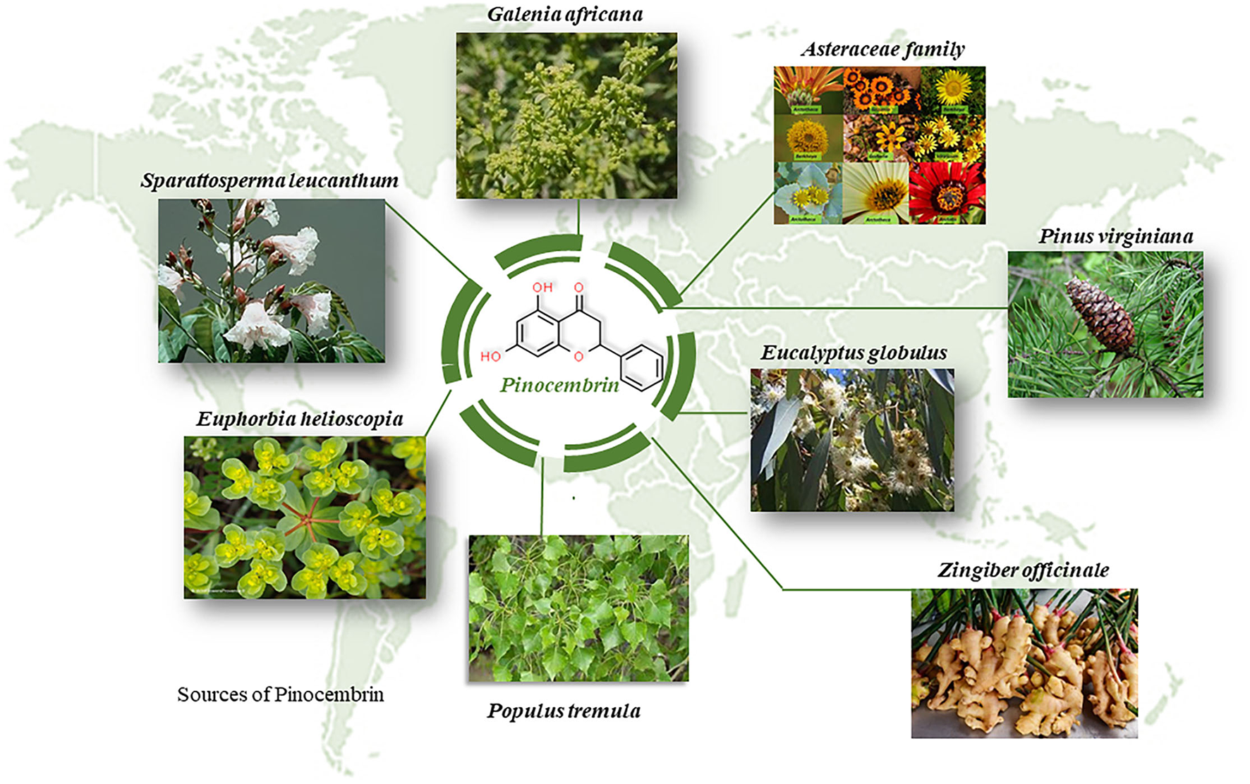 Plant sources of pinocembrin all over the globe. Pinocembrin is a plant derived flavonoid with numerous therapeutic benefits.