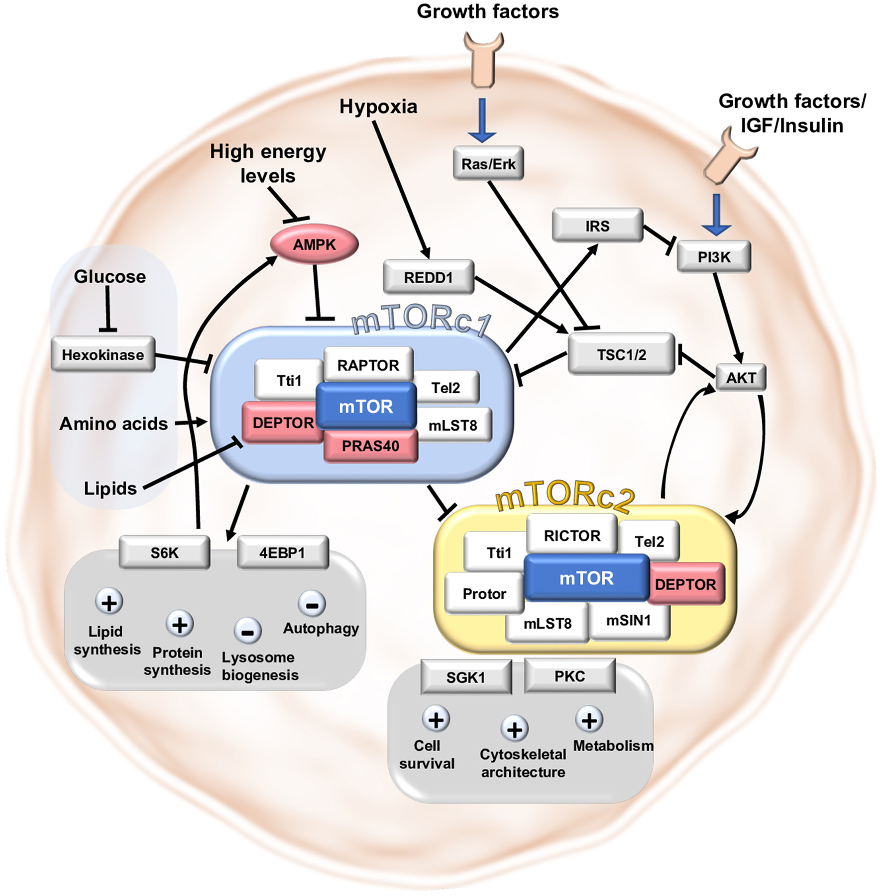 Figure 1. Main signaling pathways in mTORc1 and mTORc2. The mTOR signaling pathway is a central mediator between nutrient abundance and growth stimuli on the one hand and proliferation, metabolism and cell survival on the other hand. mTORc1 and mTORc2 are both complexes consisting of the protein mTOR and further necessary proteins assembling around mTOR. DEPTOR and PRAS40 impede mTORc1-activity and DEPTOR negatively affects mTORc2-activity. Upstream activation is reached after stimulation by growth signals/IGF1 or insulin via PI3K and AKT or independent of AKT via Ras/Erk-pathway. High abundance of nutrients like amino acids, glucose, lipids and high energy levels stimulate mTORc1 directly or indirectly. Hindering circumstances like hypoxia can inhibit the mTORc1 complex by stimulation of the inhibitory protein REDD1. Downstream targets of mTORc1 involve the proteins 4EBP1 and S6K to induce lipid and protein synthesis and block autophagy and lysosome biogenesis. mTORc2 can regulate cell survival, cytoskeletal architecture and metabolism by modulating SGK1 and PKC.