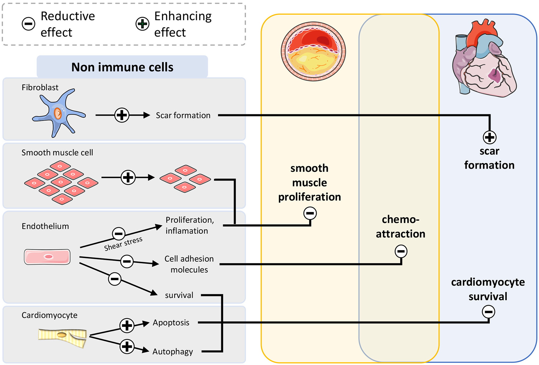 Figure 3. mTOR-inhibition affects atherosclerosis and myocardial infarction by modulation of non-immune cells. Smooth muscle cells proliferate less after mTOR inhibition leading to restrained plaque growth. Survival of endothelium and cardiomyocytes after infarction is impaired, leading to larger infarct size. Suppressive fibroblasts improve scar formation stabilizing the wound after myocardial infarction.