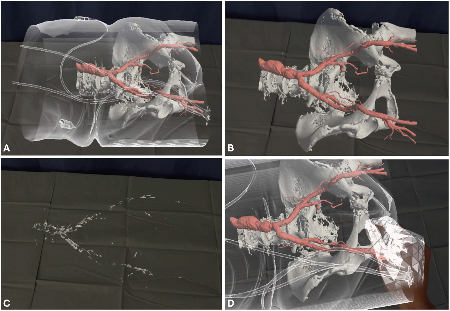 Augmented reality can simplify vascular access. The patients' CT scan is reconstructed with a proprietary software (Articor, Artiness SRL, Milano, Italy) to generate 3D holograms, that can be moved to the hybrid room and visualized with commercial holographic viewers (Hololens 2, Microsoft Inc, Redmonds, Washington, US). (A) The patients' arterial tree is seen through the transparent skin surface. (B, C) Different layers can be visualized or removed, to analyze different aspects of the vascular access (size, tortuosity, calcifications). (D) A dedicated tool can be used to simulate vascular access.