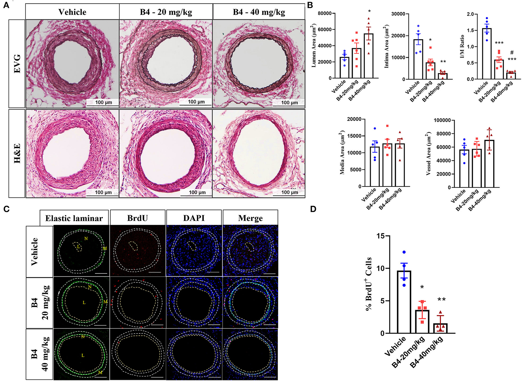 Six-week-old male C57BL/6J mice were purchased from the Jackson Laboratory. All experiments were performed in accordance with the guidelines/regulations and were approved by the Institutional Animal Care and Use Committee (IACUC) of Temple University. Mice were anesthetized with an intraperitoneal (IP) injection of ketamine (100 mg/kg) and xylazine (10 mg/kg). As previously described, the wire-induced left femoral artery injury was performed (26, 27). Mice were injected with B4 (20 mg/kg or 40 mg/kg) or equal volum of vehicle control (saline) daily intraperitoneally (IP) for 3 weeks. Mice were injected with BrdU subcutaneously (25 mg/kg) daily for 3 days and IP (30 mg/kg) 12 h before sacrifice. Femoral arteries were collected at the experimental endpoint and cryopreserved for histological staining. Cryosections (5 μm) were obtained for H&E, EVG, and BrdU staining. Morphometric analyses were performed as previously described (26, 28). Ten cross-sections were stained with H&E or EVG and used for lumen, neointimal, medial, and vessel area quantification. Each section was collected 100 μm apart to cover the whole injured vessel. Values were then averaged for each animal, and the mean was calculated from 5 to 6 animals per treatment.