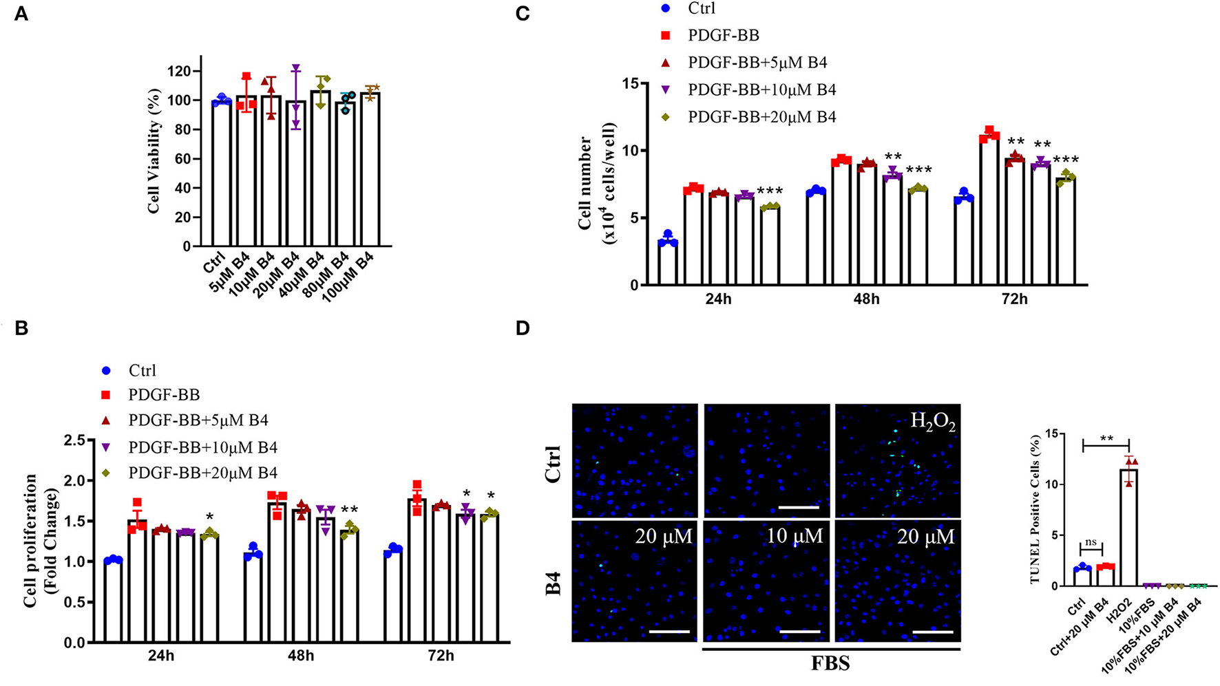 B4 inhibits MVSMCs proliferation but not cell viability or apoptosis. (A) Cell viability was measured by MTT assays. PDGF-BB-deprived MVSMCs were pretreated with 5–100 μM of B4 for 24 h and incubated with/without PDGF-BB in the absence or presence of B4 for the indicated times. Cell proliferation was detected by (B) MTT assays. (C) Direct cell counting. (D) MVSMC apoptosis was measured by TUNEL staining. Data shown are means ± SEM. N = 3. *P < 0.05; **P! < 0.01; ***P < 0.001; compared with PDGF-BB control group. Scale bar, 100 μm. All experiments were repeated at least for three times.