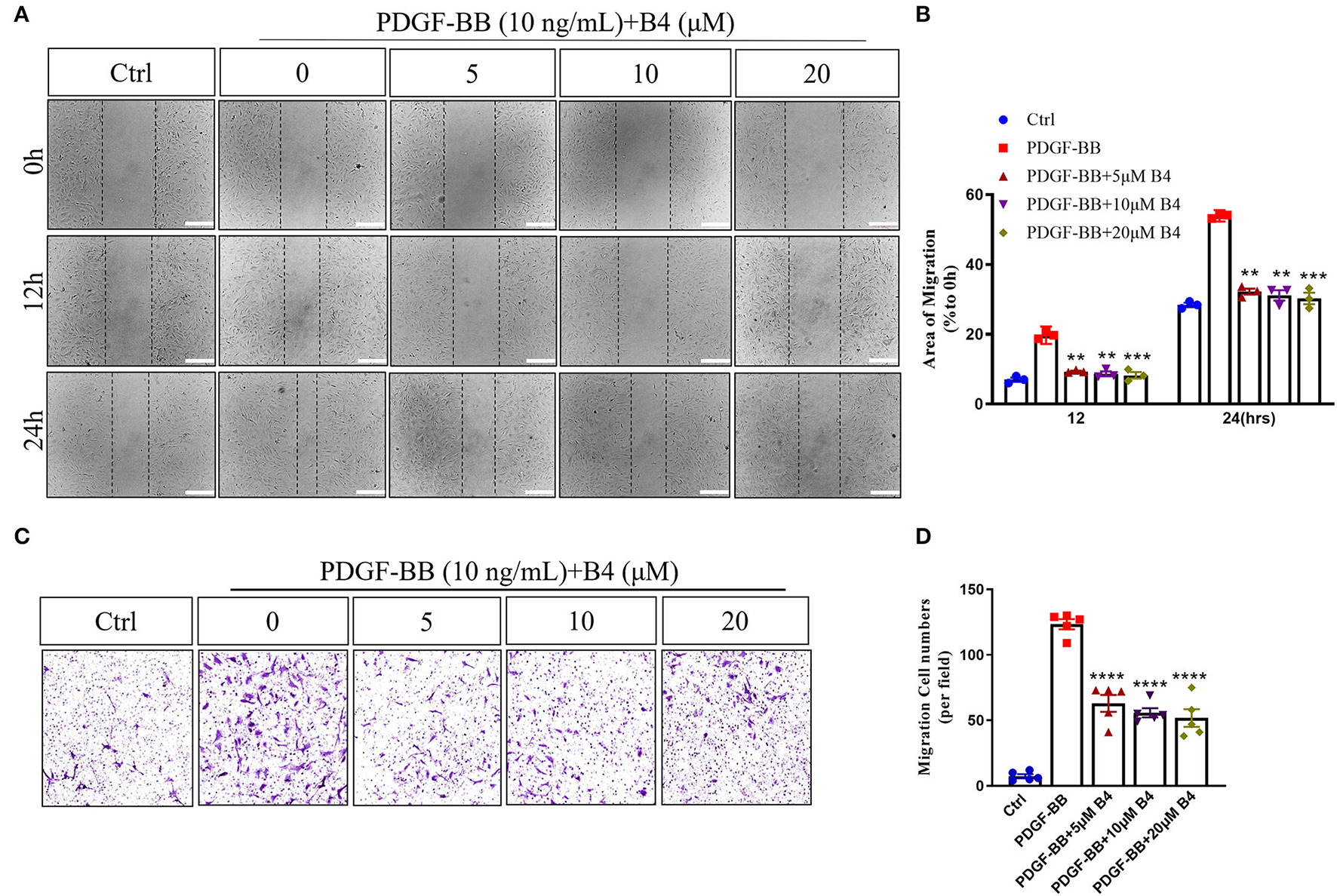 B4 prevents MVSMCs migration. (A) Representative images of quiescent MVSMCs were pretreated with B4 for 24 h and stimulated with PDGF-BB for 24 h. Images were captured at 0, 12, 24 h. The percentage of area covered by migrated cells over time was calculated using ImageJ (B). N = 3. Scale bar, 200 μm. (C) Representative images from transwell migration assay with different conditions. (D) Quantification for the number of migrated cells is shown in the bar graph. N = 5. All experiment was repeated at least three times. Data shown are means ± SEM. **P < 0.01; ***P < 0.001; ****P < 0.0001 vs. PDGF-BB control group.
