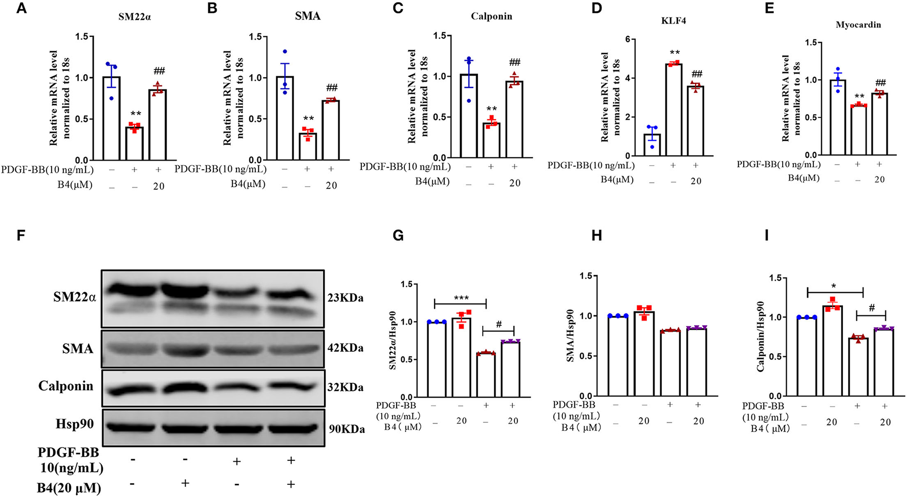 B4 abrogates PDGF-BB-induced MVSMCs dedifferentiation. MVSMCs were pretreated with B4 (20 μM) for 24 h, followed by PDGF-BB (10 ng/ml) stimulation for 48 h. (A–E) Bar graph showing the relative mRNA level of SM22α, SMA, Calponin, KLF-4, and Myocardin. (F) Western blot was employed to quantitate the expression levels of contractile protein SM22α, SMA, Calponin. Hsp90 was used as a loading control. (G–I) Bar graph showing the relative protein level of SM22α, SMA, and Calponin. Values are mean ± SEM. *P < 0.05; **P < 0.01; ***P < 0.001 vs. Control, #P < 0.05; ##P < 0.01 vs. PDGF-BB. N = 3 for each group.