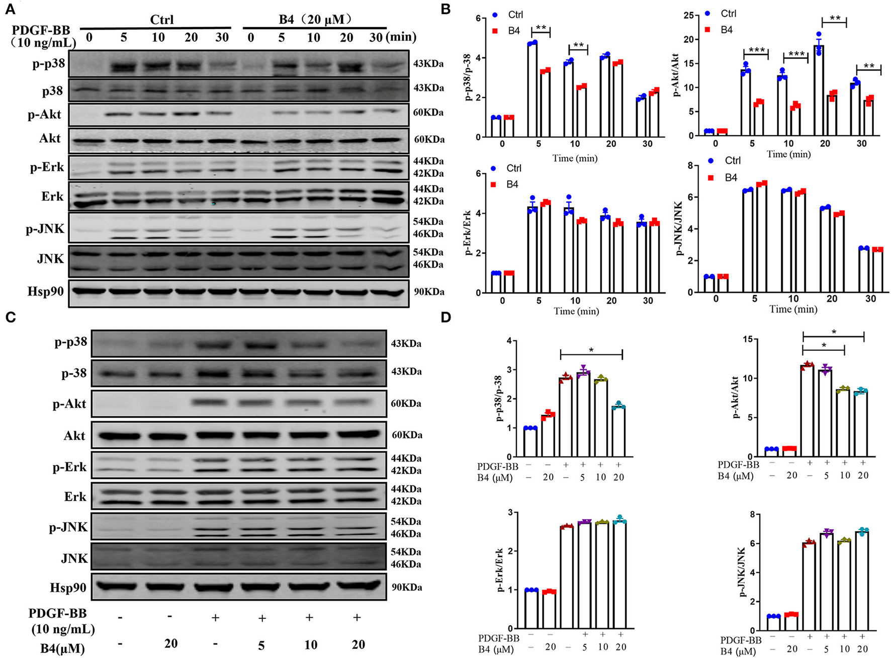 B4 inhibits PDGF-BB-induced PI3K/Akt and p-38 MAPK signaling pathway. (A) Western blot analysis of p-Akt/Akt, p-p38/p38, p-ERK/ERK, p-JNK/JNK in MVSMCs treated with B4 for 24 h and stimulated with PDGF-BB for 0–30 min. Hsp90 was used as the loading control. (B) Densitometry analysis of the phosphorylation protein normalized to the total protein levels. (C) Western blot analysis of MVSMCs treated with different concentrations of B4 (0, 5, 10, 20 μM) for 24 h and stimulated with PDGF-BB 10 ng/ml for 15 min. The protein expression levels of p-p38/p38, p-Akt/Akt, p-ERK/ERK, and p-JNK/JNK were blotted. Hsp90 was used as a loading control. Representative western blots from three experiments are shown. (D) Densitometrical analysis of the western blots. Data shown are means ± SEM. N = 3. *P < 0.05; **P < 0.01; ***P < 0.001; compared to non-stimulated control group. All experiments were repeated at least for three times.