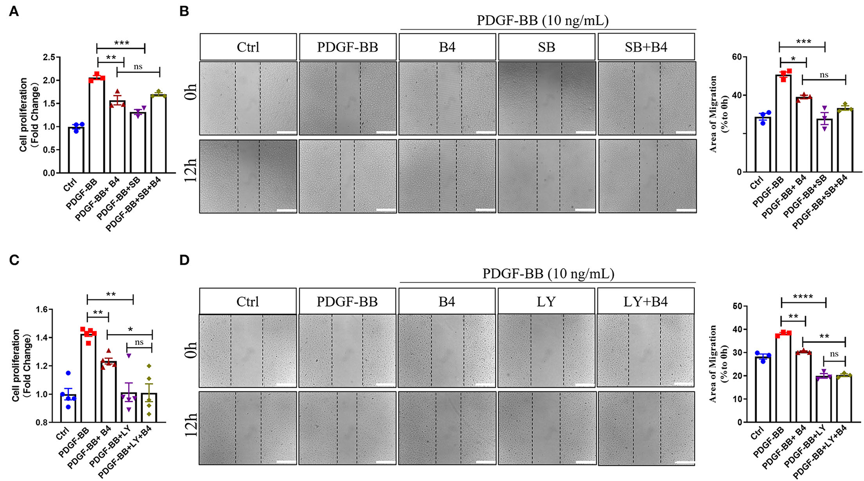 An abnormal increase in VSMC proliferation and migration is pivotal to neointima development in post-angioplasty restenosis. Inhibiting the VSMC migration and proliferation may be a plausible strategy for controlling the neointima hyperplasia in vascular remodeling-related disorders (48, 49). Our results indicate that the B4 inhibitory affects PDGF-BB-induced VSMC proliferation and migration (Figures 3A–C), protecting against neointimal hyperplasia in vivo (Figure 1). Our study provides the first direct evidence for the inhibitory effect of the B4 on PDGF-BB-induced VSMC migration, proliferation, and pathological vascular remodeling processes such as neointimal hyperplasia.