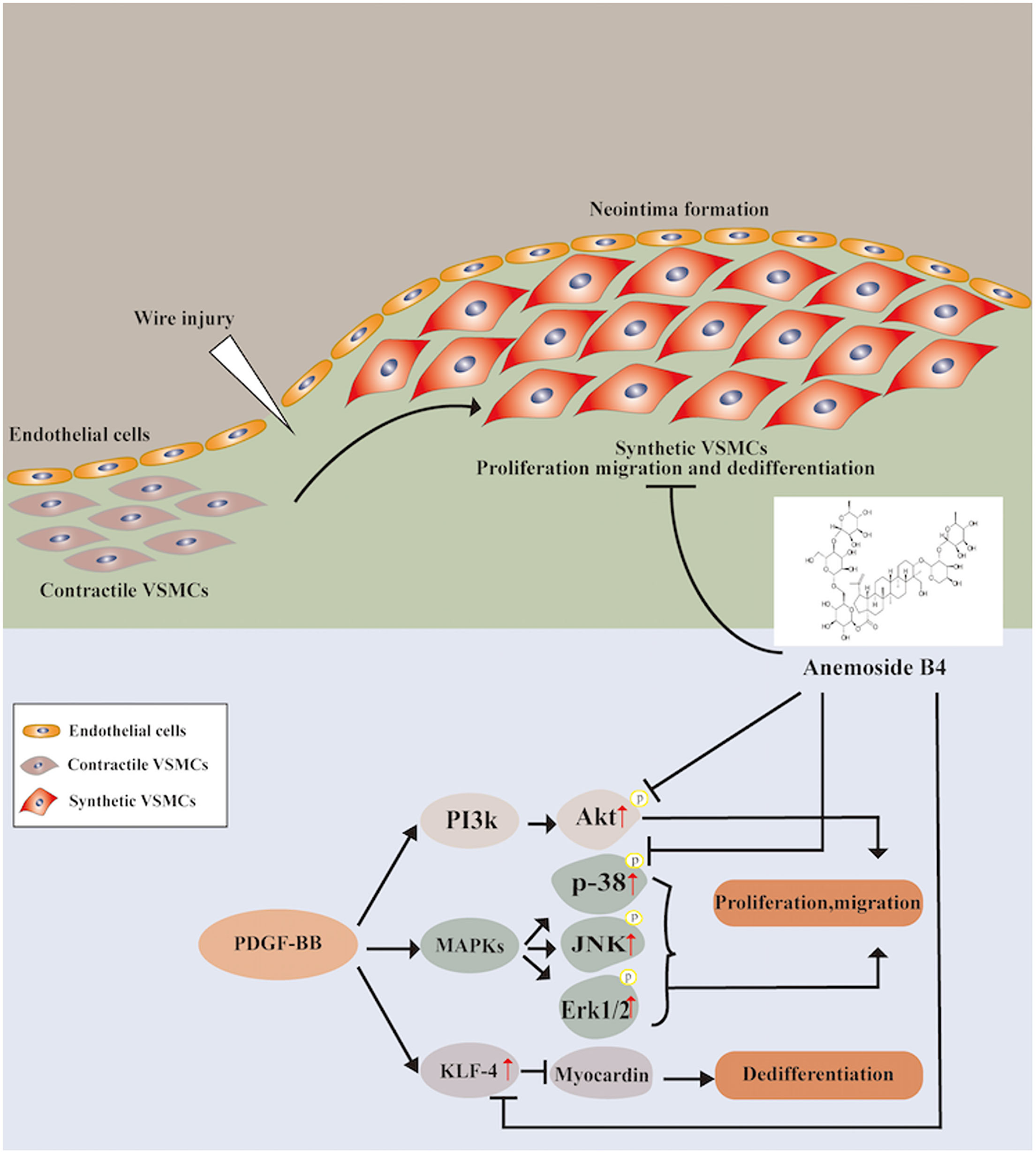 However, the role of B4 in modulating neointima hyperplasia and VSMC function is unknown. In the current study, we aimed to determine the effect of B4 on VSMC proliferation and migration and its ability to attenuate restenosis in vivo. Our data point to a model wherein B4 inhibits PDGF-BB-induced VSMC proliferation and migration, prevents the transformation of VSMCs from contractile to the synthetic phenotype, and attenuates neointima formation in a mouse acute femoral artery injury model through PI3K/Akt and p38 MAPK signaling. For the first time, our results reveal that B4 is a promising saponin to ameliorate occlusive vascular disease.