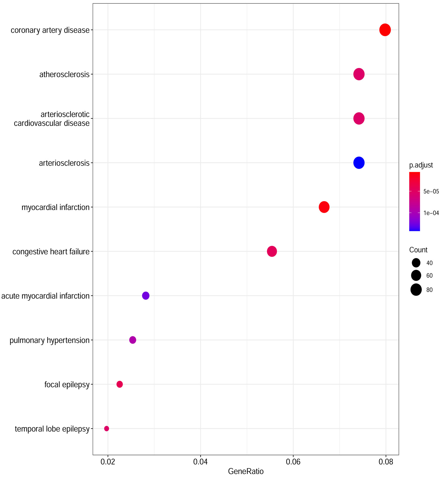 Based on the cut-off criteria of adjusted P < 0.05 and |log2FC| more than or equal to 1, a total of 2080 DEGs were identified from GSE152418, including 1905 upregulated genes and 175 downregulated genes. p.adjust < 0.05 and gene counts more than or equal to 20 were used as the DO screening condition. Figure 1 shows the top ten most significantly enriched diseases, coronary artery disease, atherosclerosis, arteriosclerotic cardiovascular disease, arteriosclerosis, myocardial infarction, congestive heart failure, acute myocardial infarction, pulmonary hypertension, focal epilepsy and temporal lobe epilepsy. The enrichment results of other diseases by DO analysis are shown in Table 2.