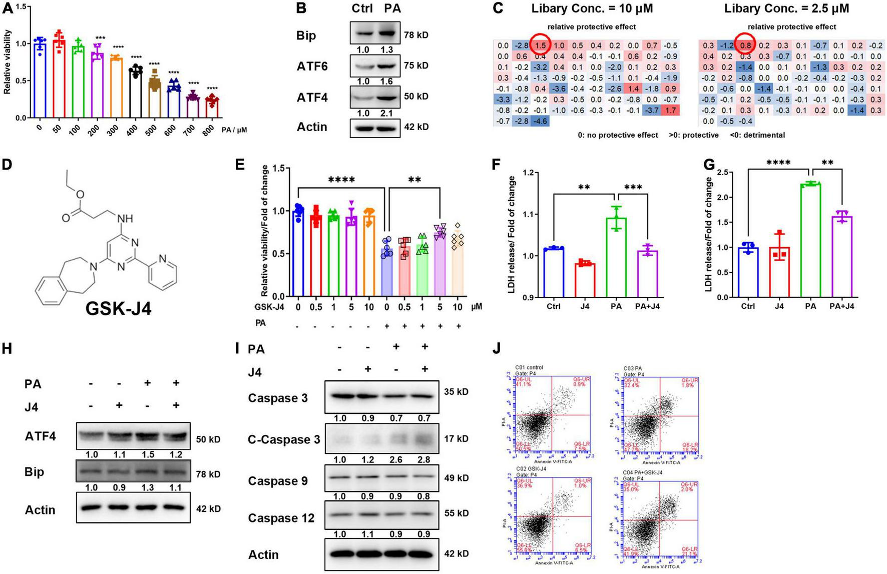 GSK-J4 ameliorates PA-induced cardiomyocyte injury independent from apoptosis. (A) PA dose-dependently reduces cell viability. (B) Significant ERS is induced by 400 μM PA stimulation for 24 h. (C,D) Screen potential protective drugs by cell viability with ERS-related drug screen library (MCE, New Jersey, United States, HY-L054, ERS Library, HYCPK8142) at two different concentrations (C) and found that GSK-J4 shows a significant protective effect at both concentrations. The molecular structure of GSK-J4 is shown in (D). (E) Confirm the screen result by CCK-8, and GSK-J4 indeed has a protective effect at 5 μM concentration. (F) PA induces LDH release from AC16 cells, while GSK-J4 reduces LDH release. (G) PA induces LDH release from NRCM, while GSK-J4 reduces LDH release. (H) GSK-J4 attenuates PA-induced ERS. (I,J) GSK-J4 does not ameliorate PA-induced cell apoptosis as evidenced by no altered caspases (I) and Annexin V/PI double staining (J). **P < 0.01, ***P < 0.001, ****P < 0.0001, all the data significance was analyzed by ANOVA.