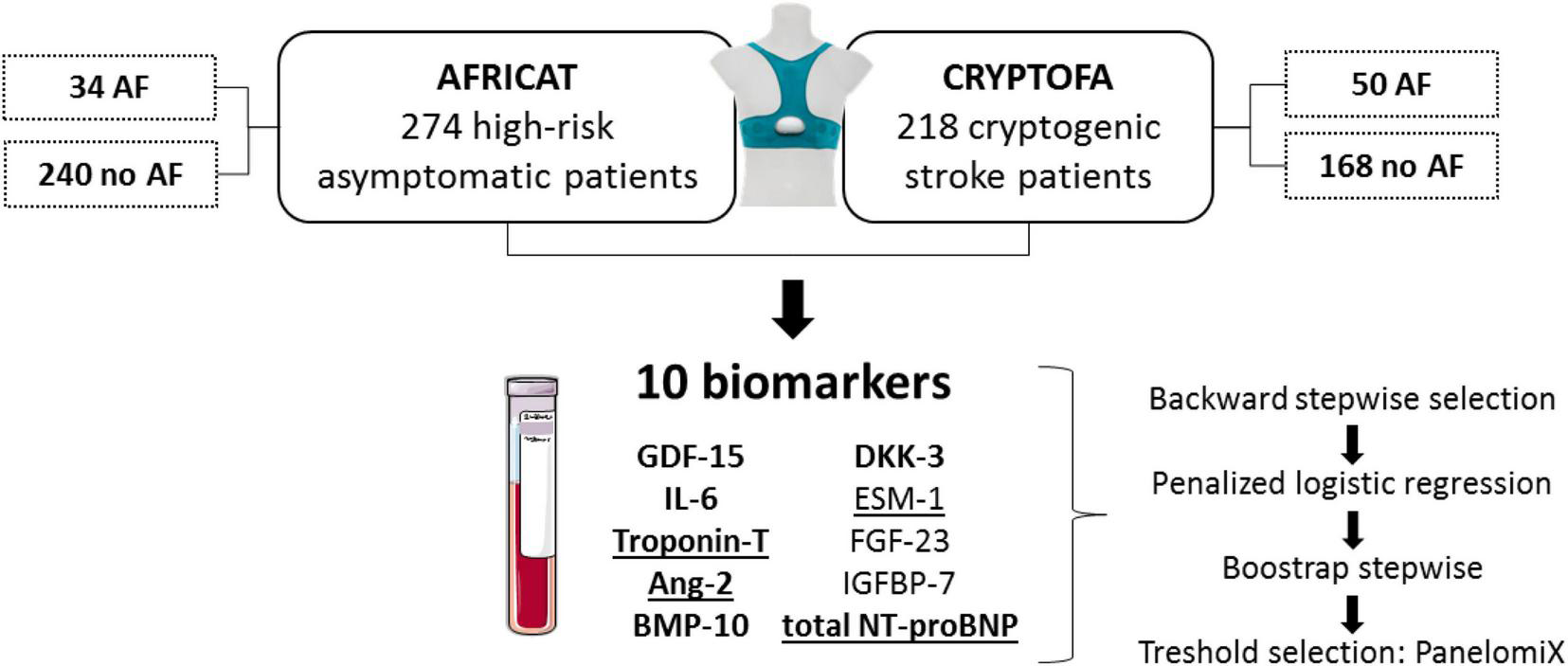 Two hundred seventy-four subjects aged 65–75 years with hypertension and diabetes from the AFRICAT cohort, and 218 cryptogenic stroke patients aged >55 years from the CRYPTO-AF cohort were analyzed. AF was assessed by 4 weeks of monitoring with a wearable Holter device (NuuboTM™). Blood was collected immediately before monitoring started. 10 candidate biomarkers were measured by automated immunoassays (Roche, Penzberg) in the plasma of all patients. Univariate and logistic regression analyses were performed in each cohort separately.