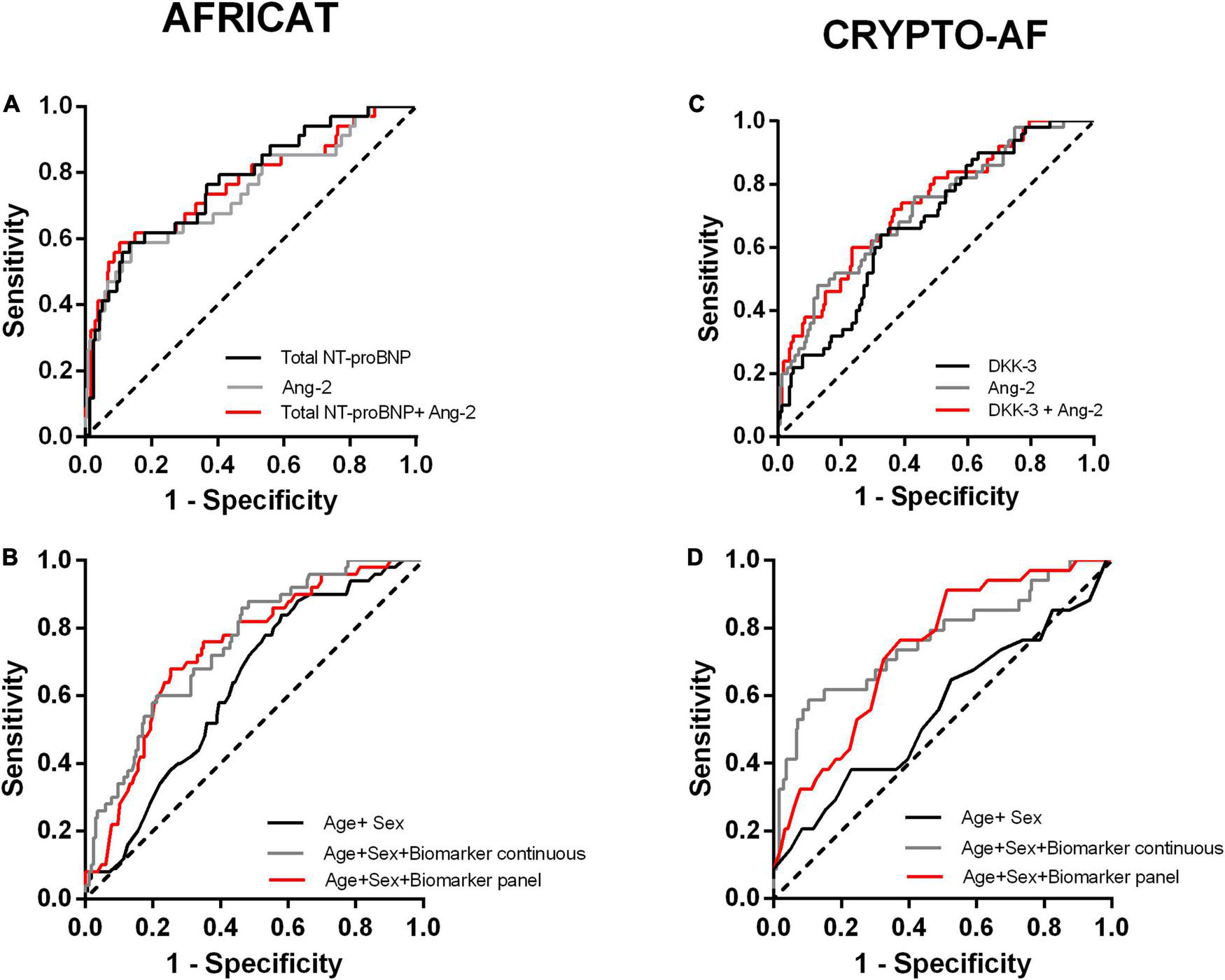 Receiver operating characteristic (ROC) curves of the constructed models for the two cohorts. (A, B) Performance of the models constructed for the AFRICAT cohort. (C, D) Performance of the models constructed for the CRYPTO-AF cohort. (A, C) ROC curves including Ang-2,Total NT-proBNP, or DKK-3 alone, and combined as continuous variables for each cohort. (B, D) ROC curves for the clinical model alone (Age + Sex) and in combination with the biomarkers as continuous variables or dichotomized according to the panel with the best accuracy.