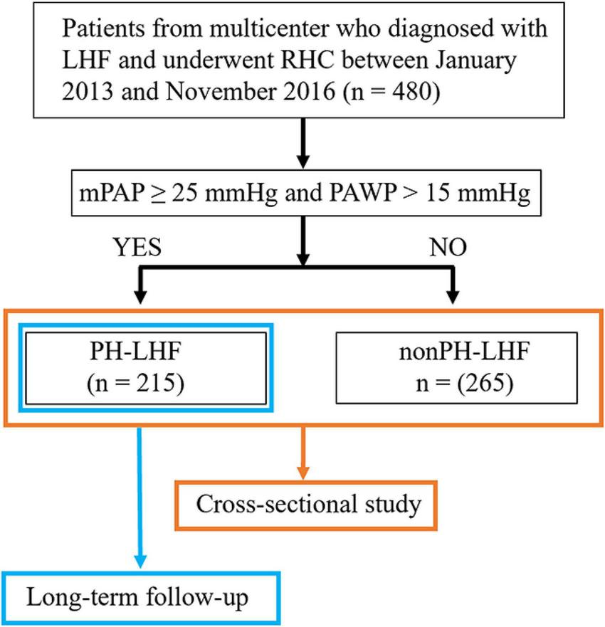 The study design and flowchart for the selection of patients. LHF, left heart failure; RHC, right heart catheterization; mPAP, mean pulmonary artery pressure; PAWP, pulmonary artery wedge pressure; PH-LHF, pulmonary hypertension due to left heart failure.