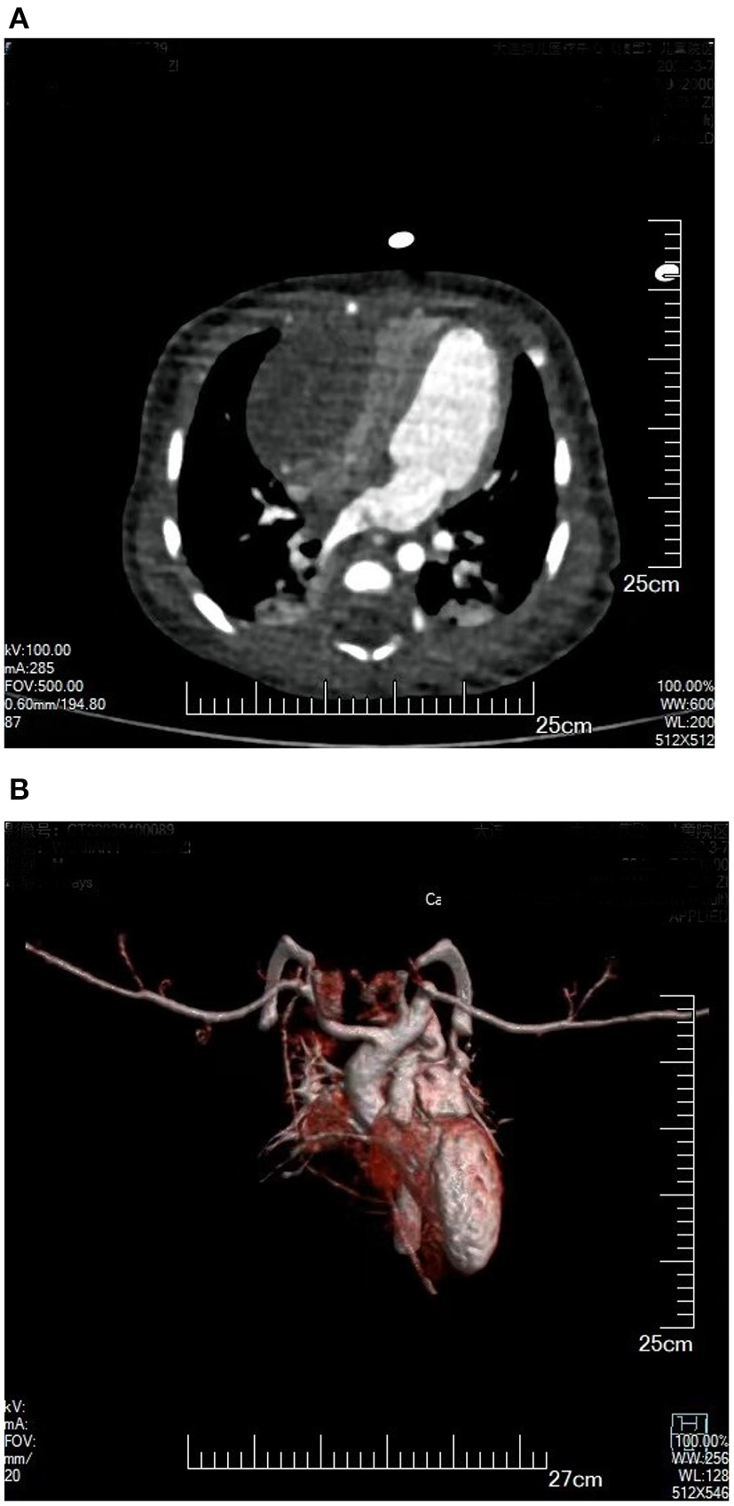 (A) Plain CT scan: Enormous space-occupying mass on a right ventricular wall, with compressed right ventricle cavity. (B) 3D reconstruction of cardiac blood flow: The right ventricular inflow tract was compressed by tumor, without obvious blood flow filling.