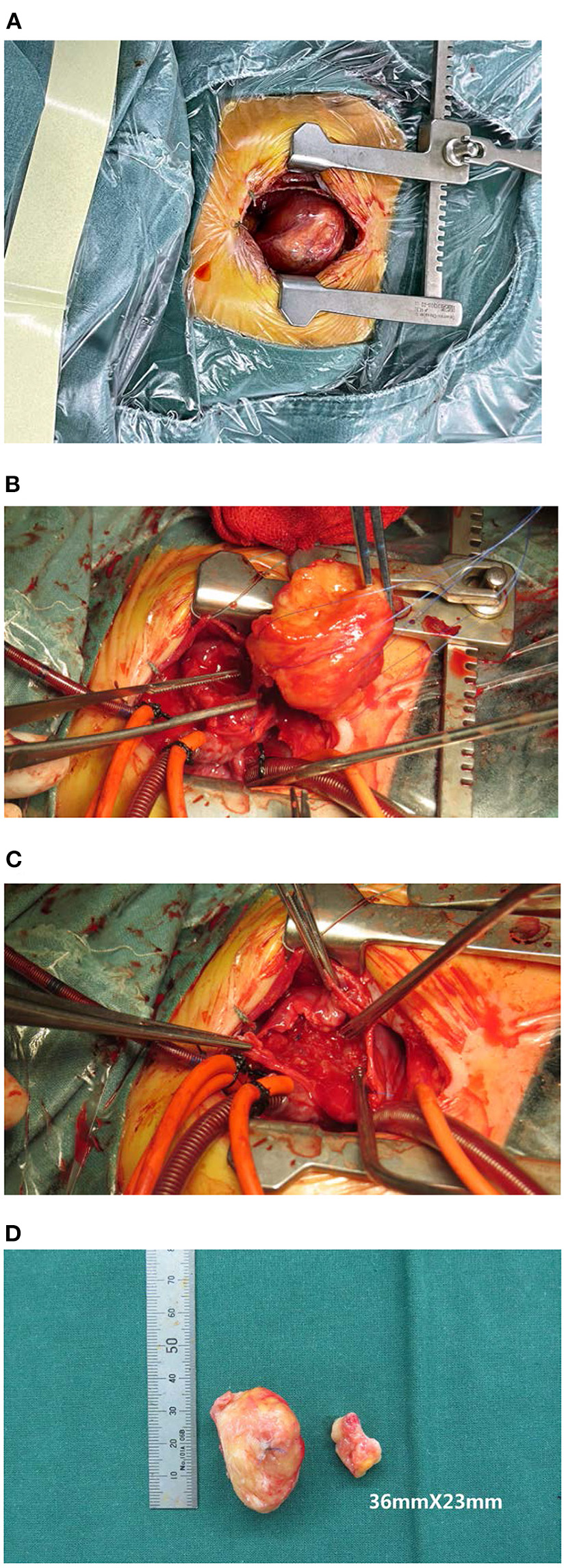 (A) Tumor appearance before an operation; (B) Removal of a tumor; (C) During operation, right ventricular wall wound after tumor removal; (D) Tumor specimen appearance.