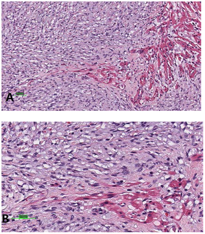 Examination under a light microscope (A); Magnification: 20x, and (B) 40x (hematoxylin and eosin staining).