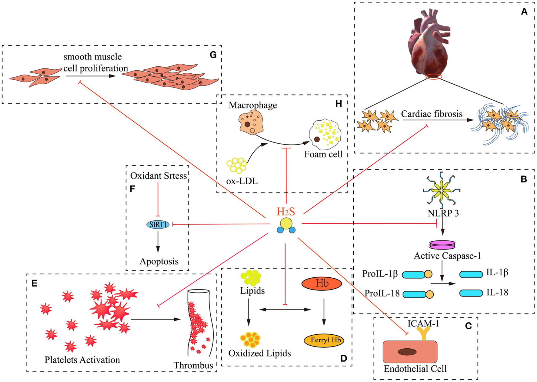 Mechanisms of H2S “multi-angle” inhibition of AS. H2S exerts numerous critical effects against the pathogenesis of atherogenesis. These include: (A) improving myocardial fibrosis; (B) inhibiting the production of IL-1β and IL-18; (C) inhibiting ICAM-1 expression in TNF-alpha-induced HUVECs via the NF-kappa B pathway; (D) preventing lipid peroxidation; (E) inhibiting intravascular thrombosis; (F) protecting against apoptosis under oxidative stress through SIRT1 pathway; (G) inhibiting smooth muscle cell proliferation; (H) attenuating foam cell formation.