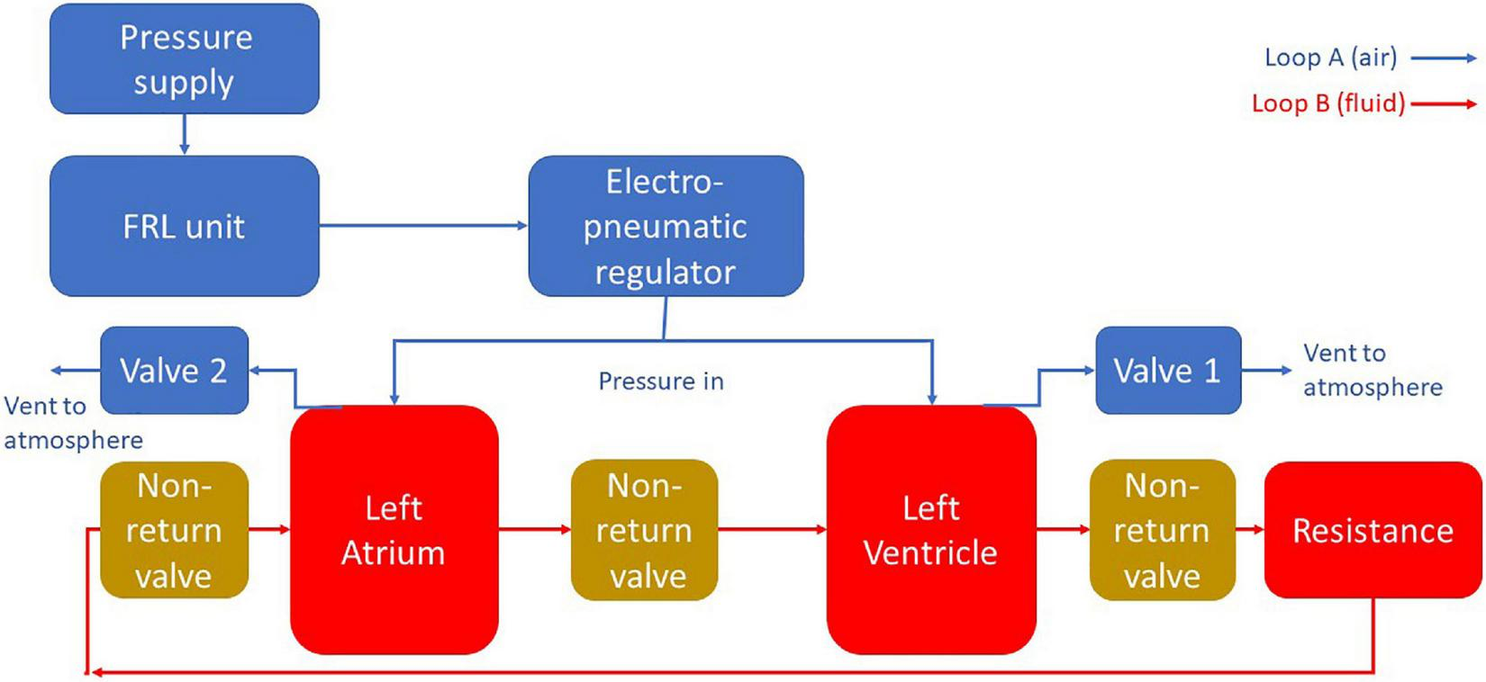A schematic diagram of the MCL apparatus. Pressure is delivered to the chambers using pneumatic regulation. The flow in the blood loop is achieved by selectively pressurizing and depressurizing the heart chambers using solenoid valves. Backflow is prevented through the use of non-return valves.