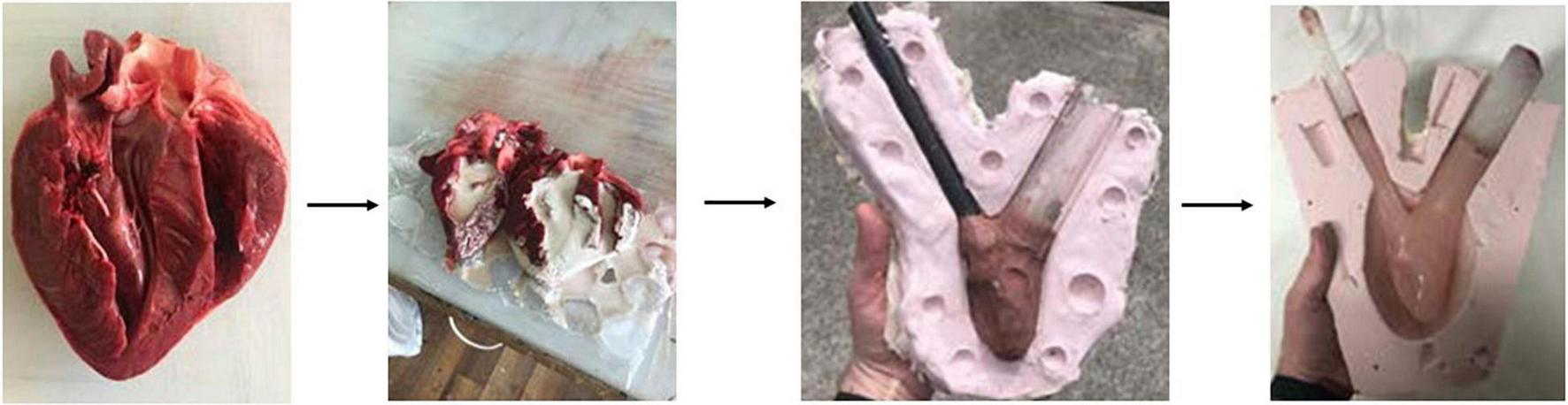 The internal volume of the left ventricle was cast using room-temperature vulcanizing silicone. Chavant clay was used with attached tubing to form the core for the reverse molding of the RTV silicone. The silicone outer mold was then used to rapidly produce multiple cores made of paraffin wax. Finally, the final chamber model was produced by pouring Platsil Gel 10 silicone into the interstitial space between the larger mold and the wax core.