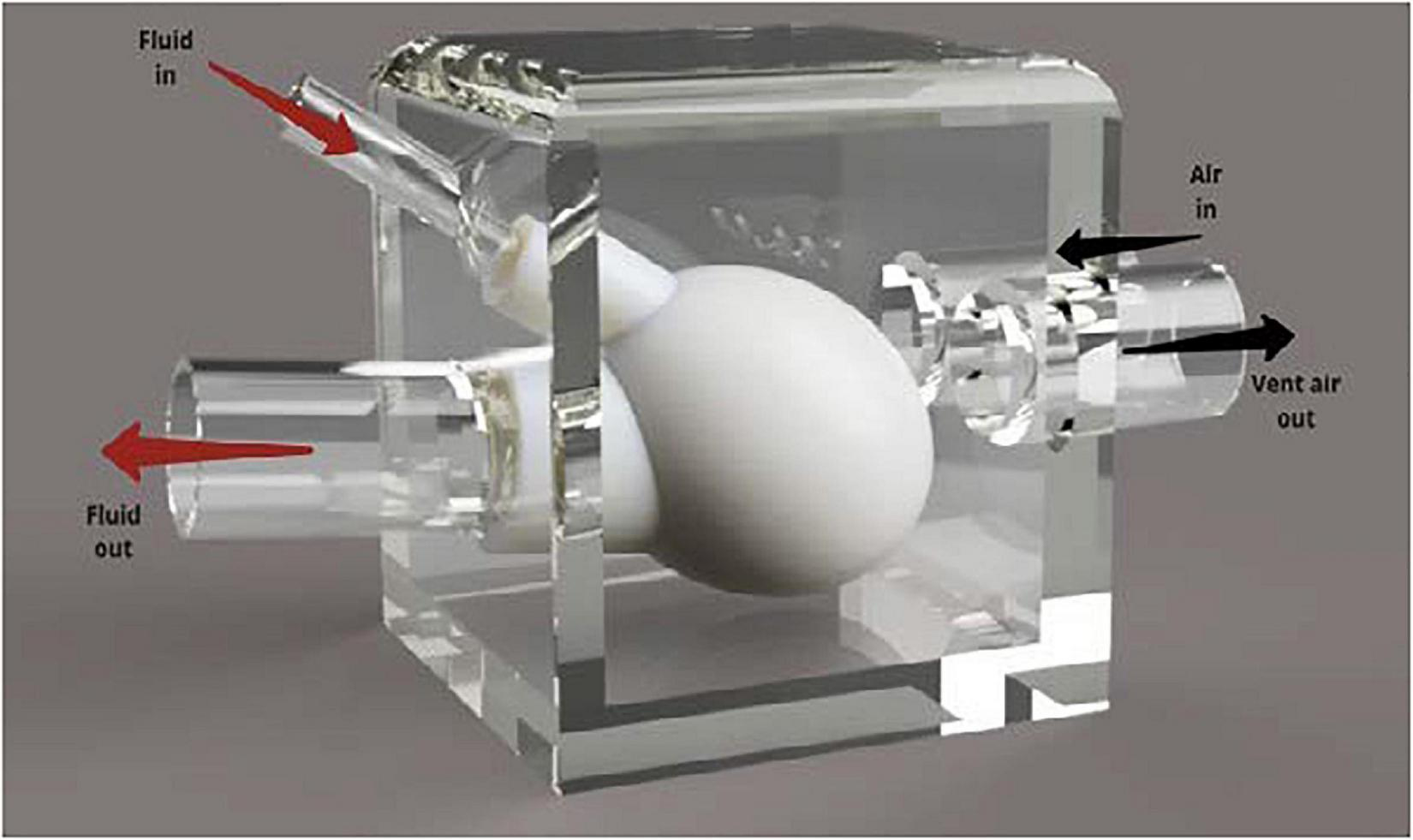 To allow for compression of the silicone heart chamber, the model was placed in a modified plastic container. A render of this design can be seen in Figure 3. The plastic container was chosen because it was a readily available, airtight vessel with a removable lid that was large enough to house the silicone ventricle. It was important that the testing assembly included a lid so that the device could be adjusted during testing. Using forstner drill bits, two holes were drilled into the side of the container and PVC tubing that was positioned in the holes. The tubing was then secured in place using hot glue. The silicone blood vessels were then pushed over the PVC tubing and secured in place using cable ties. Two additional holes were drilled into the side of the box so that compressed air could be pumped into the box using the pneumatic system and vented through the solenoid valve, respectively. The container was pressurized to a pressure of 20 kPa (∼150 mm Hg) to overcome the stiffness of the silicone and deliver physiological pressure to the internal blood mimic.