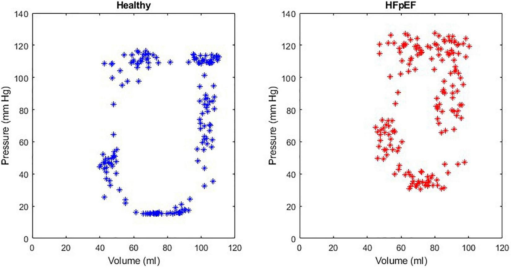 An example of a healthy PV loop and HFpEF PV loop generated from data recorded on the MCL Mk II.