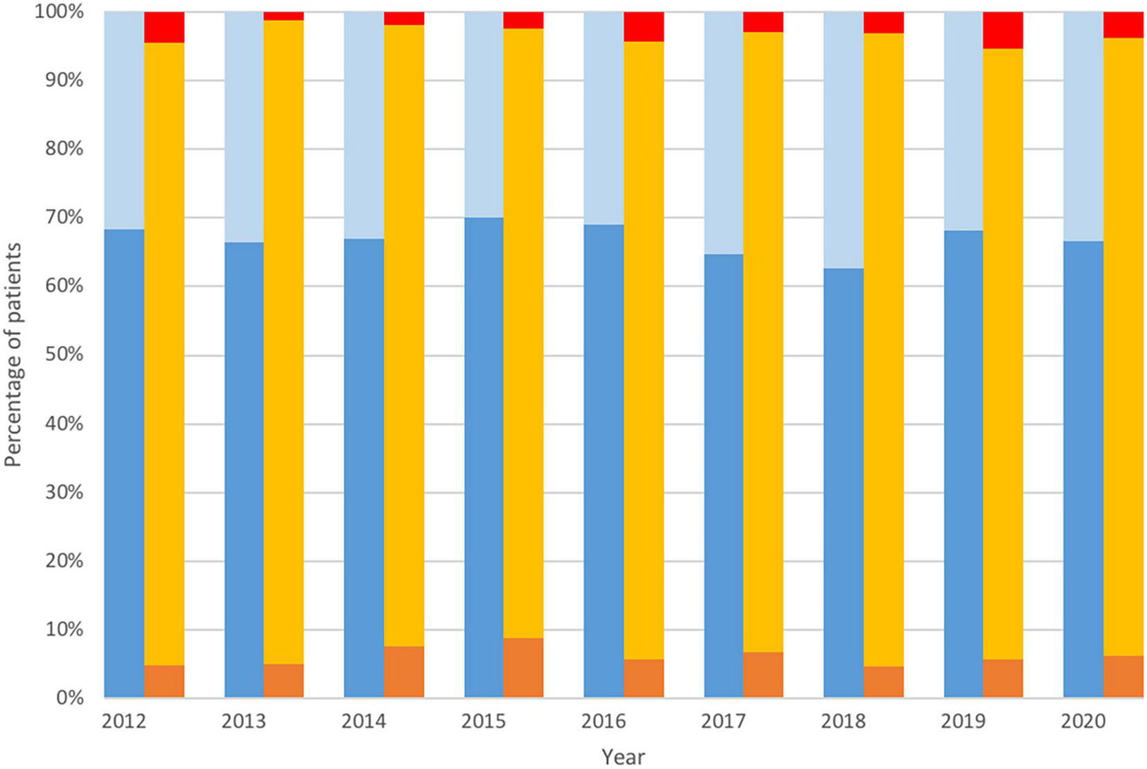 Temporal trends in completeness of revascularization and utilization of arterial grafting. Complete revascularization (dark blue), non-complete revascularization (light blue), multiple arterial grafting (orange), single arterial grafting (yellow), total arterial revascularization (red).