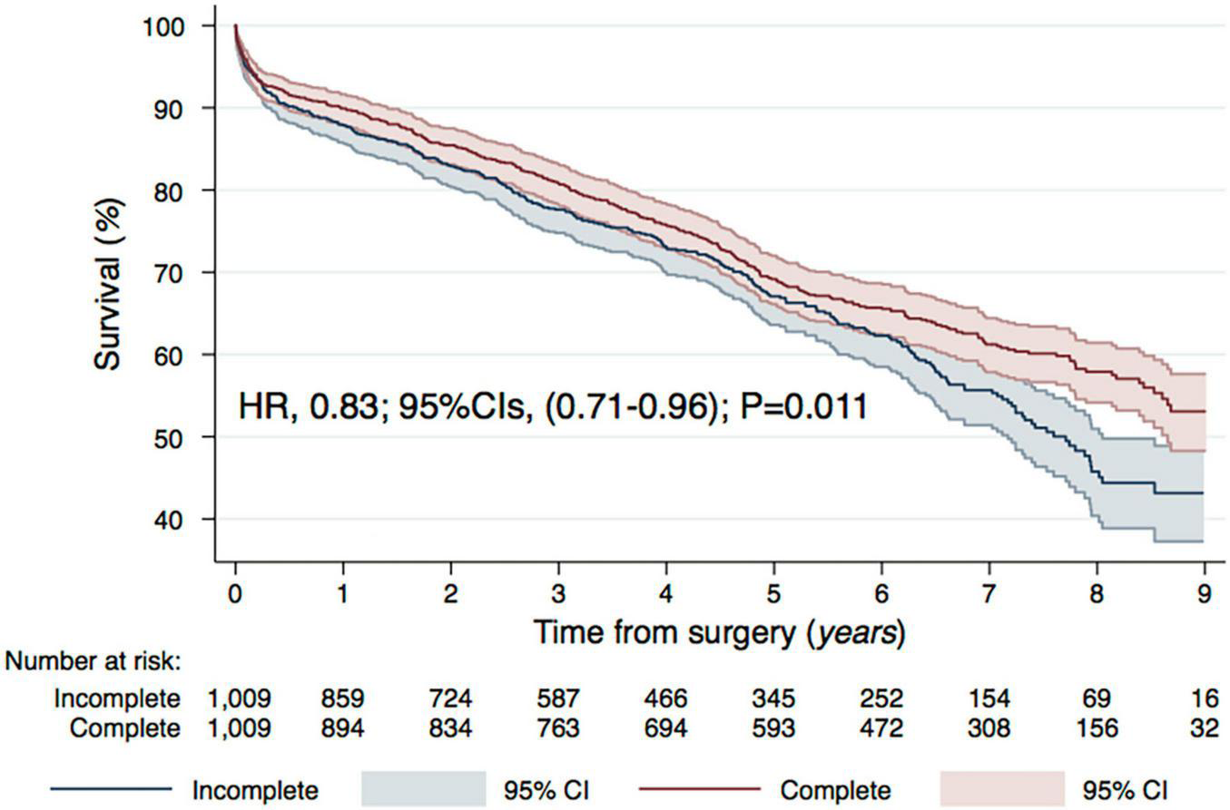 In-hospital outcomes and post-operative complications were consistent between groups (Table 4). Early mortality (24 h) and 30-day mortality were unaffected by CR [Odds Ratio (OR) and 95% Confidence Intervals (CIs): 1.34 (0.46–3.86), P = 0.593, Hazard Ratio (HR) and 95% CIs: 0.88 (0.59–1.32), P = 0.542, respectively]. Cardiac tamponade and/or re-thoracotomy for bleeding occurred in 3.1 vs. 5.1% and was statistically more frequent in the CR group [Risk Ratio (RR) and 95% CIs, 1.65 (1.06–2.55), P = 0.032]. Cardiopulmonary bypass (CBP) and aortic X-clamp times were significantly longer in the CR group: the median of CBP time was 65 vs. 79 min (P ≤ 0.001) in the CR and non-CR group and respectively 34 vs. 40 min (P ≤ 0.001) of aortic X-clamp time. In the long-term follow-up [As stated in the abstract median follow up was 4.7 years (2.3–6.9)], CR was associated with significantly lower mortality [HR (95% CIs) 0.83 (0.71–0.96), P = 0.011] (Figure 2).