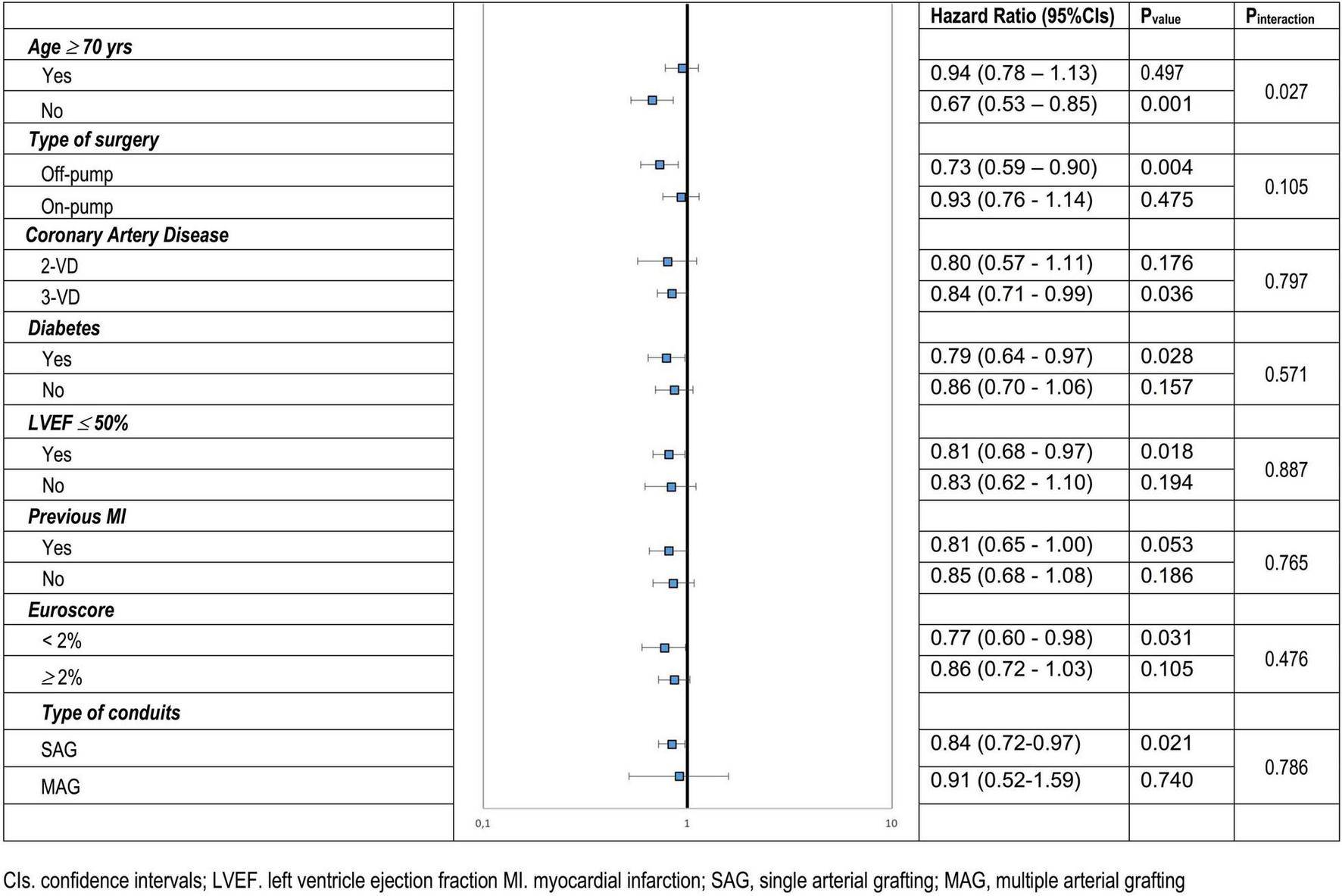 Median follow-up was 4.7 years [interquartile range (IQR) 2.3–6.9]. PSM resulted in 1,009 pairs of complete and incomplete revascularization. Number of distal anastomoses varied, accounting for 3.0 + –0.6 vs. 1.7 + –0.6, respectively. Although early (< 24 h) and 30-day post-operative mortalities were not statistically different between non-CR and CR patients [Odds Ratio (OR) and 95% Confidence Intervals (CIs): 1.34 (0.46–3.86); P = 0.593, Hazard Ratio (HR) and 95% CIs: 0.88 (0.59–1.32); P = 0.542, respectively] the long term mortality was nearly 20% lower in the CR cohort [HR (95% CIs) 0.83 (0.71–0.96); P = 0.011]. This benefit was sustained throughout subgroup analyses, yet most accentuated in low-risk patients (younger i.e., < 70 year old, with a EuroSCORE II < 2%, non-diabetic) and when off-pump CABG was performed.