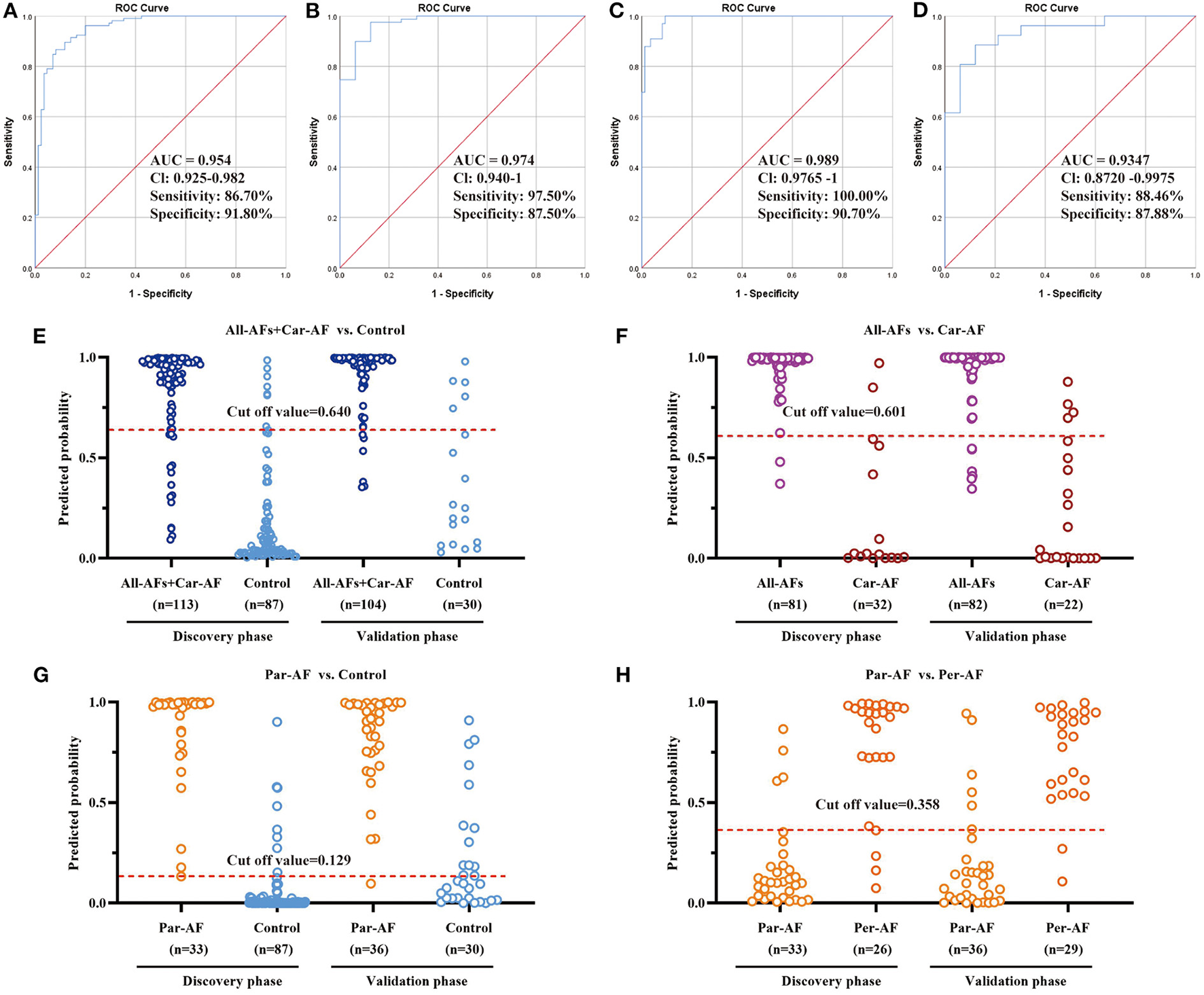 A total of 363 participants were enrolled (Figure 1). The discovery phase enrolled 229 volunteers, namely, 86 Control, 30 Sus-AF, 32 Car-AF, and 81 All-AFs (22 Fir-AF, 33 Par-AF, and 26 Per-AF) cases. We present baseline characteristics and laboratory data in Table 2 and Supplementary Tables 1, 2. The validation phase included 134 participants, namely, 30 Control, 17 Fir-AF, 36 Par-AF, 29 Per-AF, and 22 Car-AF cases. Their baseline characteristics are shown in Supplementary Tables 3, 4.