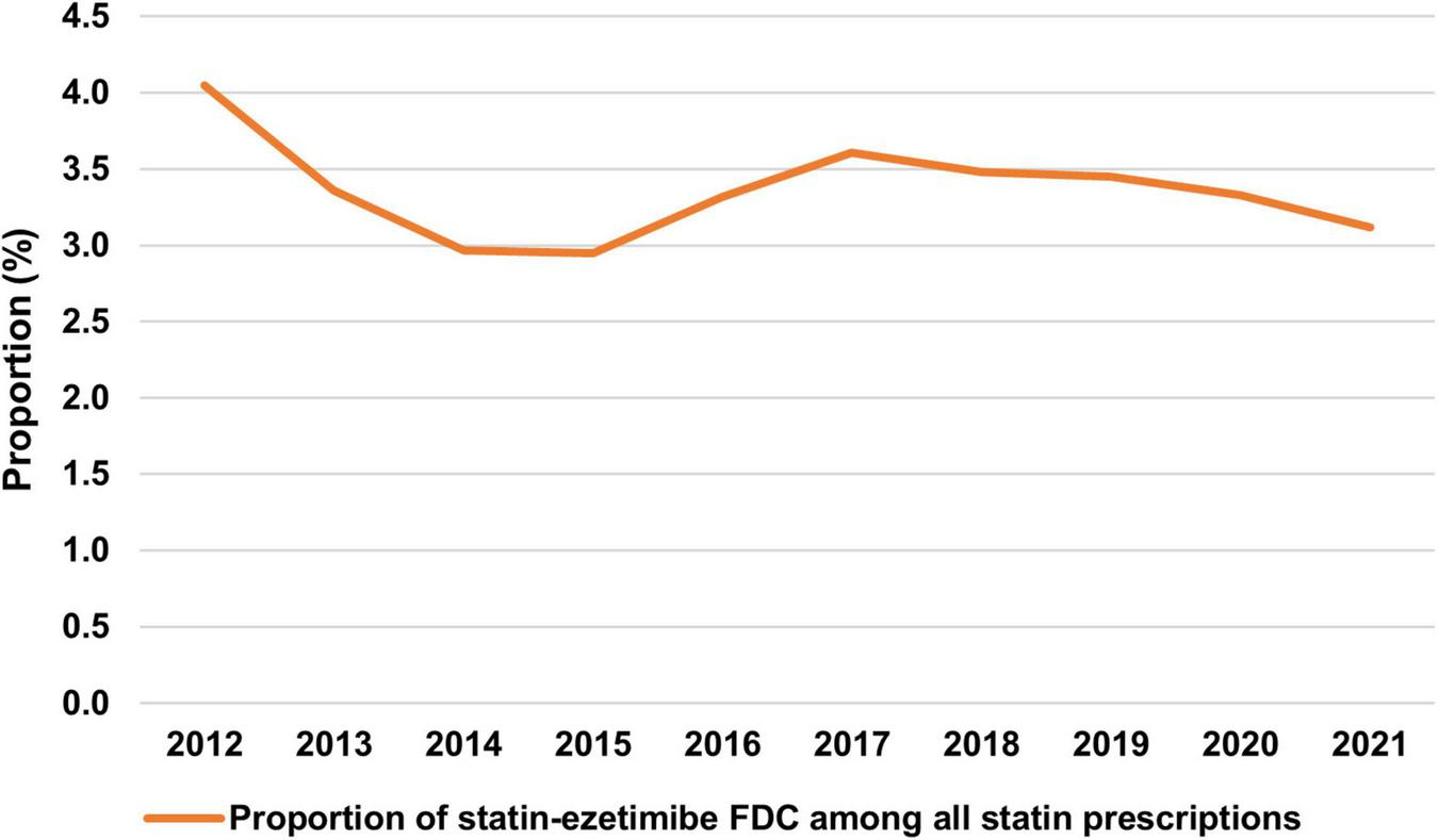 The proportion of statin-ezetimibe FDC among all statin prescriptions ranged at approximately 3% with no clear trend between 2012 and 2021 (Figure 3).