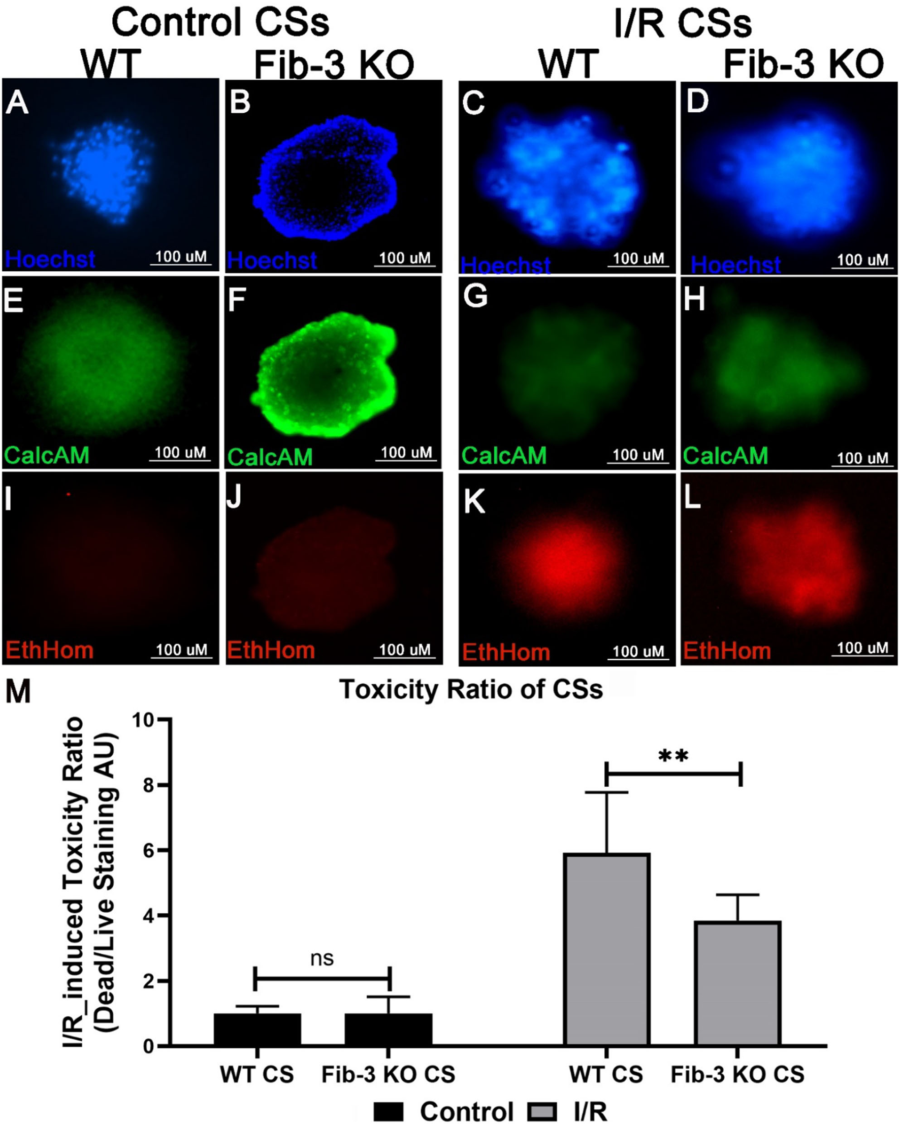 Fib-3 KO CSs are less sensitive to changes in oxygen concentrations compared with WT CSs. (A–L) Representative images of control and I/R WT and Fib-3 KO CSs stained with calcein-AM (green), ethidium homodimer (red) and Hoechst stain (blue), staining live, dead, and total cells, respectively. (A–D) stained with Hoechst, (E–H) with calcein-AM, and (I–L) and ethidium homodimer. (M) Statistical analyses of toxicity ratios for control and I/R CSs. Two-way ANOVA with Sidak's multiple comparison test, p>0.05= ns and p < 0.01 = **. Error bars represent the mean ± SD (n>6).