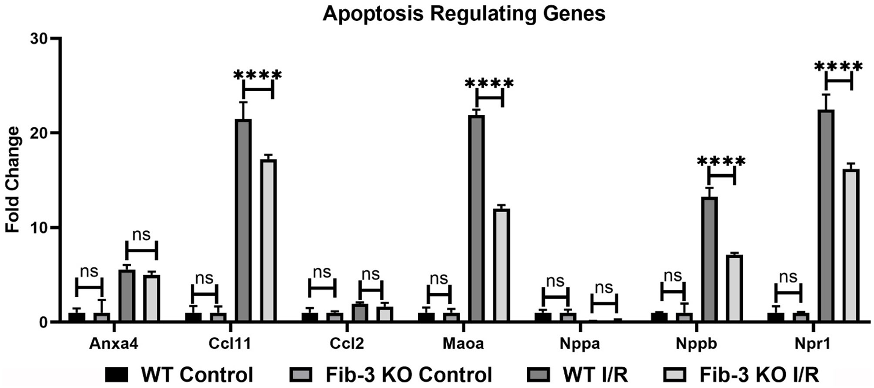 Changes in apoptosis regulating genes in WT and Fib-3 KO CSs following I/R injury. Relative expression of Anxa4, Ccl11, Ccl2, Maoa, Nppa, Nppb and Npr1 in WT and Fib-3 KO CSs. Two-way ANOVA with Sidak's multiple comparison test, p > 0.05 = ns and p < 0.0001= ****. Error bars represent the mean ± SD (n = 4).