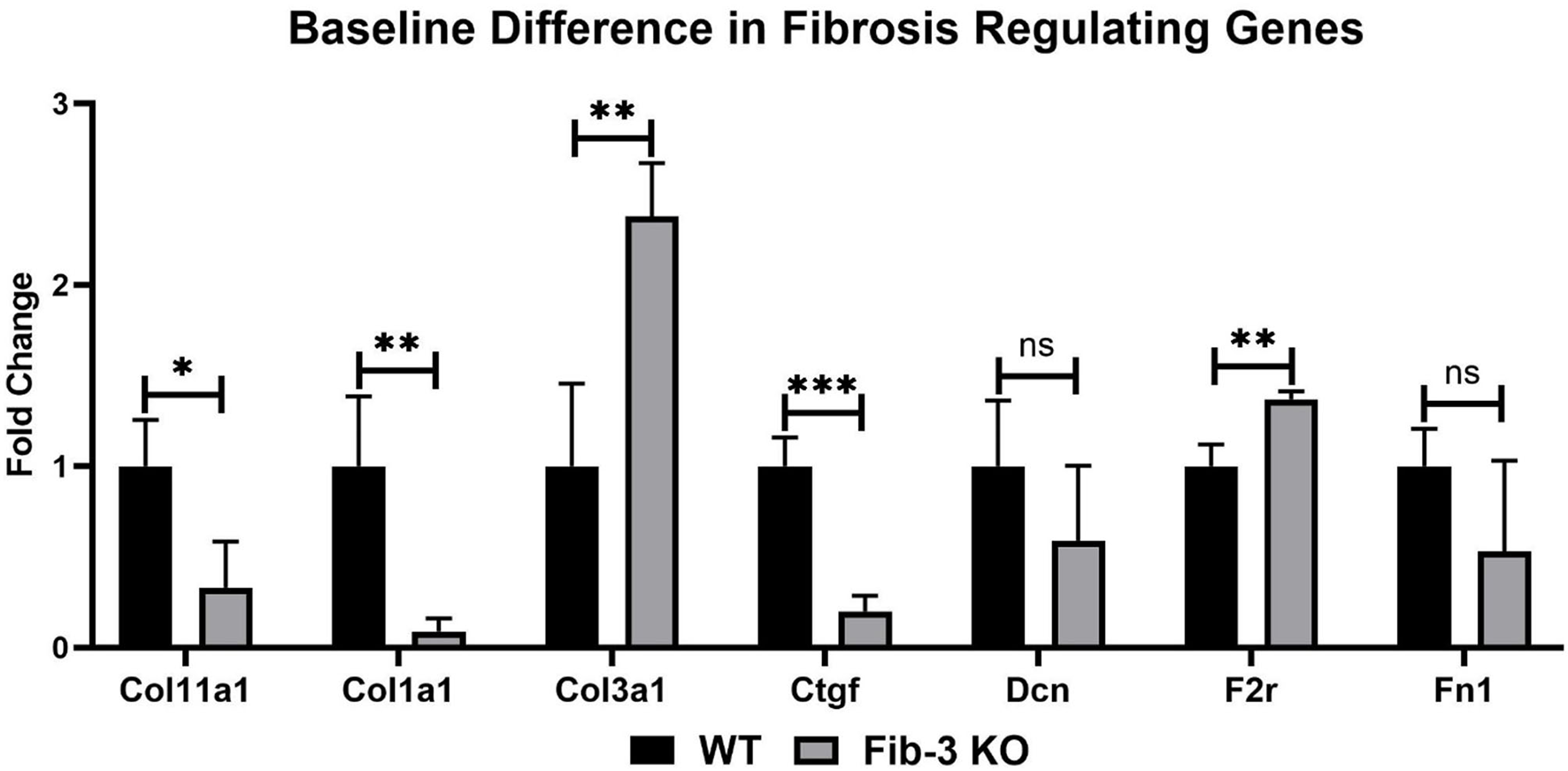 Changes in fibrotic genes in non-infarcted WT and Fib-3 KO CSs. Relative expression of Col11a1, Col1a1, Col3a1, Ctgf, Dcn, F2r and Fn1 in WT and Fib-3 KO CSs. Unpaired t-test, p > 0.05 = ns, p < 0.05 = *, p < 0.01 = ** and p < 0.001 = ***. Error bars represent the mean ± SD (n = 4).