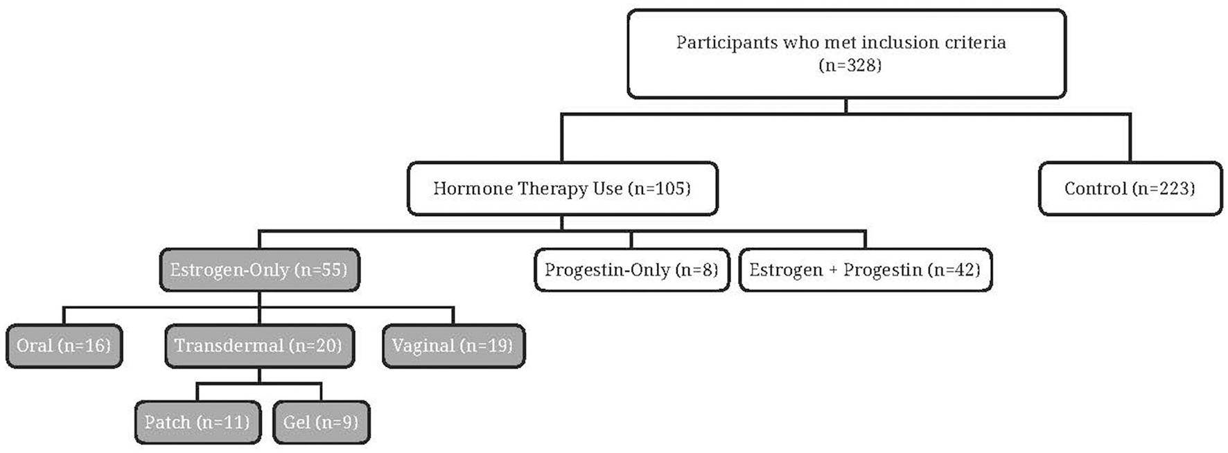 Of the 328 participants recruited (Figure 1), the majority (n = 223) reported never using HT. Approximately one-third (n = 105) reported current or past use of HT and just over half reported estrogen-only HT (n = 55). Among the oral estrogen-only HT users, few participants were currently using oral estrogen (n = 2), with most reporting past use (n = 14). Similar numbers of current (n = 20) and past estrogen use (n = 19) were reported by non-oral (transdermal and vaginal) estrogen-only HT users.