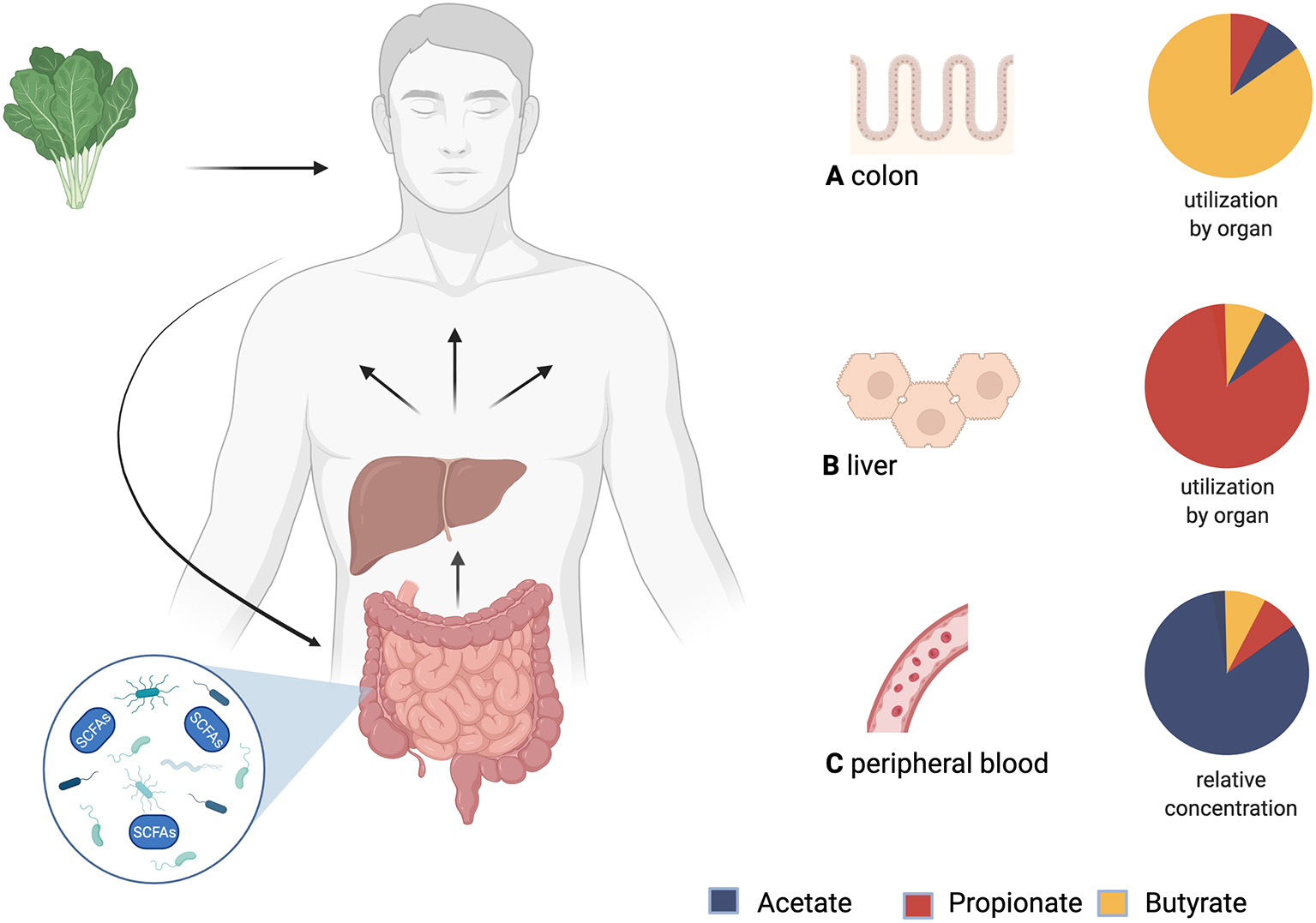Production, distribution and yield of short-chain fatty acids (SCFAs) in different tissues. After consumption, undigested fiber reaches the colon and is fermented by microbiota. The product of this process are SCFAs. Via the portal vein SCFAs are transported to the liver and then systemically distributed. (A) Utilization of SCFAs in the colon: Butyrate is an important energy source for colonocytes. (B) Utilization of SCFAs in the liver: Propionate is mostly metabolized in the liver. (C) Relative concentrations of SCFAs in peripheral blood: Acetate has the highest peripheral concentrations. This is followed by propionate, while butyrate shows the lowest peripheral concentrations (43). Created with BioRender.com.