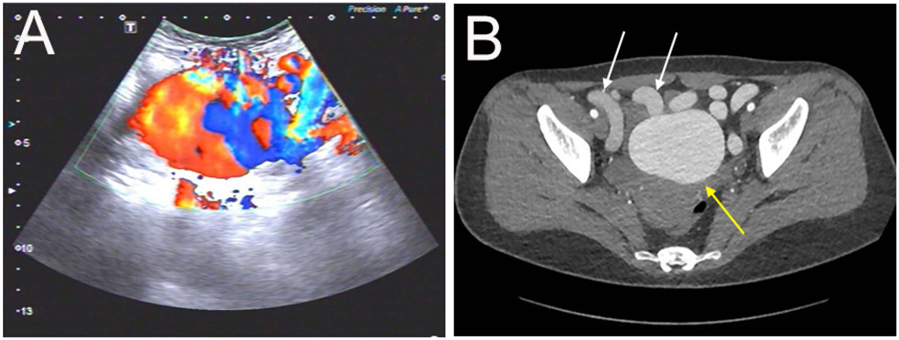 Evaluation of the abdominopelvic arteriovenous malformation (AVM) with color Doppler ultrasound and CT angiography. (A) The ultrasound revealed a pelvic mass with an abundant blood flow signal. (B) The axial view of CT angiography showed the nidus of AVM (yellow arrow) and dilated outflow veins (white arrows) (the aneurysm was measured as 72 ×56 mm).