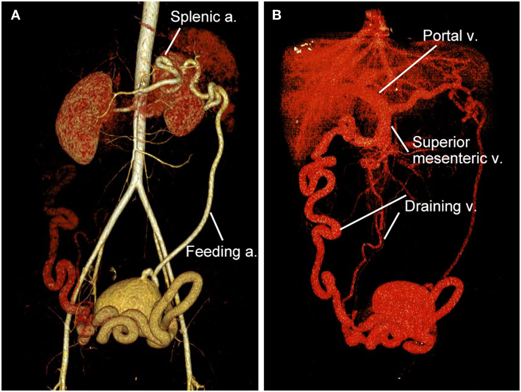 3D reconstruction of CT angiography of the abdominopelvic arteriovenous malformation (AVM). (A) Arterial phase of CT angiography showed the AVM had a single feeding artery originating from the splenic artery. (B) Venous phase of CT angiography showed the AVM had two draining veins into the superior mesenteric vein and then the portal vein.