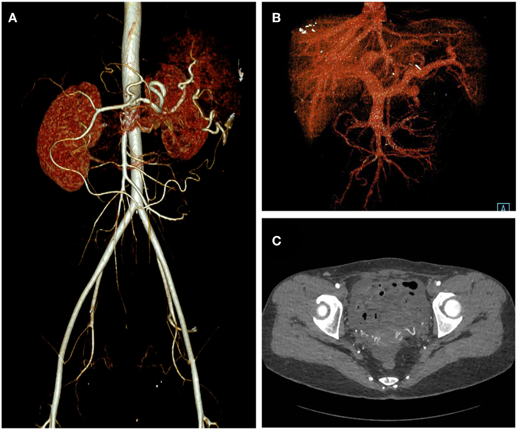 One-month post-operative CT angiography of the patient. Arterial phase (A), Venous phase (B), and axial view (C) of the CT angiography showed elimination of the abdominopelvic AVM.