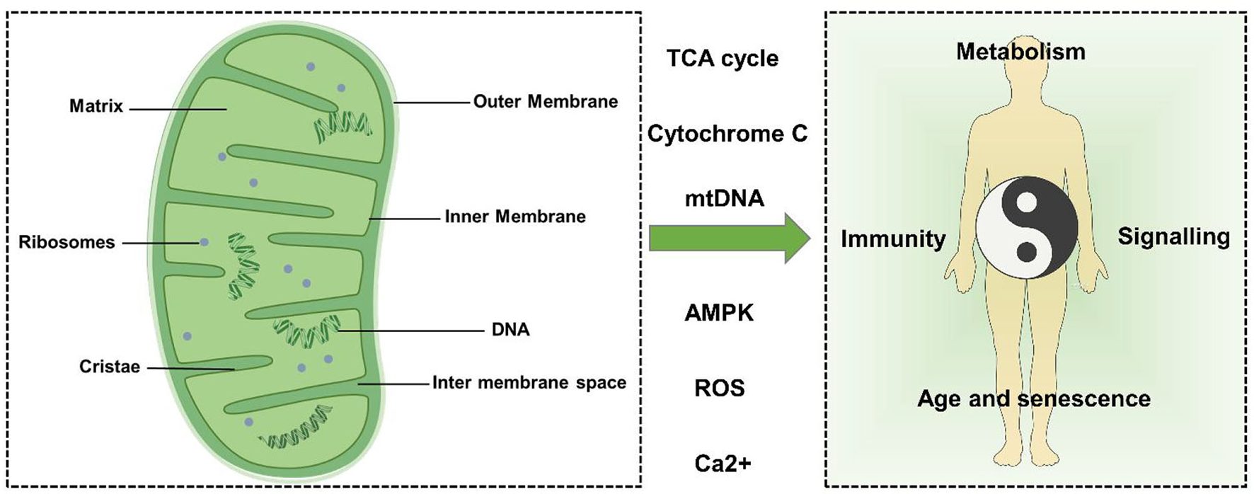 Mitochondrial structure and function. Mitochondria can be divided into four functional regions from outside to inside: outer mitochondrial membrane, intermembrane space, inner mitochondrial membrane, and mitochondrial matrix. Mitochondria can regulate metabolism, signal transduction, immune regulation, cell senescence, and death through TCA cycle metabolites, cytochrome c (Cytc), mtDNA, Ca2+, ROS, AMPK, and other factors, thus affecting the balance of the human body.