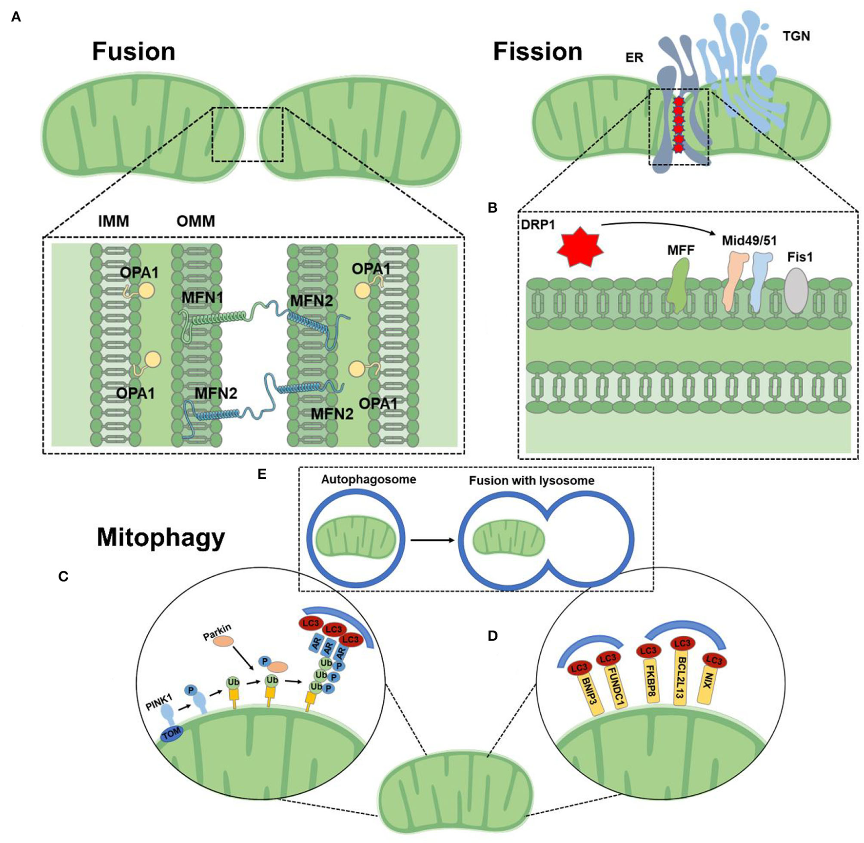 Mitochondrial function. (A) Mitochondrial fusion is mediated by homo-and heterotypic interactions between MFN1 and MFN2 at the OMM and OPA1 at the IMM. (B) DRP1 binds to its receptors at the OMM at sites of contact with the ER. (C) The PINK1/Parkin-dependent pathway: under stress conditions, PINK1 was stable on OMM, which promoted the recruitment of Parkin. Parkin ubiquitizes several outer membrane components. The polyubiquitin chain is then phosphorylated by PINK1 as a “eat me” signal for the autophagy mechanism. Autophagy receptors (AR) recognize phosphorylated polyubiquitin chains on mitochondrial proteins and initiate autophagosome formation by binding to LC3. (D) The PINK1/Parkin-independent pathway: mitophagy receptors, such as BNIP3, NIX, FKBP8, and FUNDC1 are located to directly interact with OMM and LC3 to mediate mitochondrial clearance. (E) Mitochondria are engulfed by autophagosomes, which fuse with lysosomes and catabolize them.