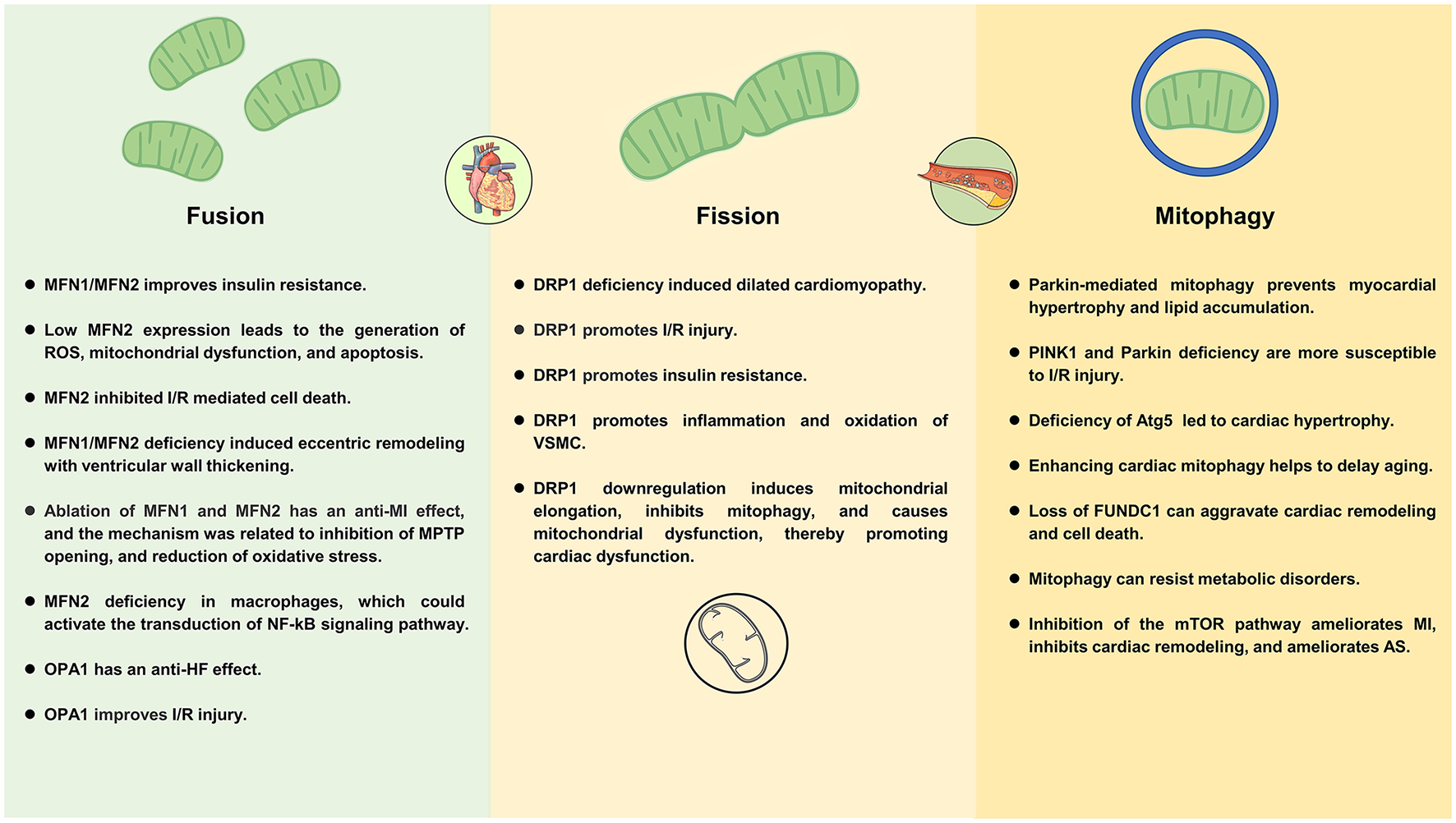 In conclusion, the role of proteins regulating mitochondrial fusion and fission on MI is divergent, and there seems to be a bidirectional regulation, and the beneficial and detrimental effects still need further validation. Notably, promoting mitophagy is beneficial for MI.