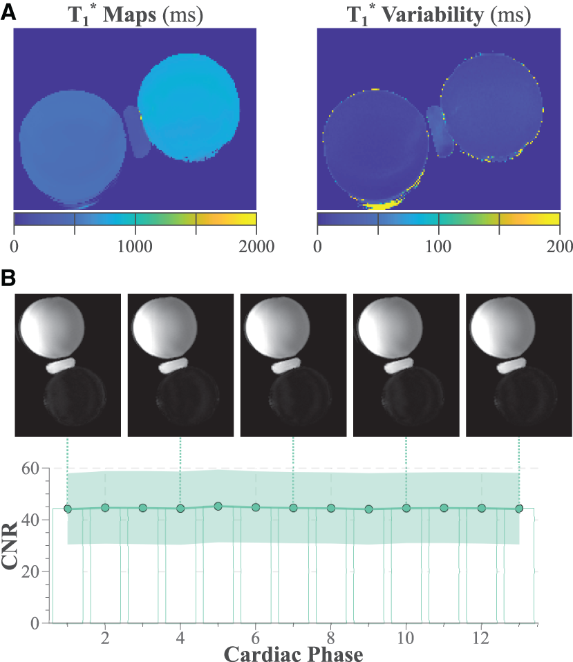 (A) acquired in phantom with the proposed functional LGE sequence. The left panel shows the maps averaged across the simulated cardiac cycle, while the right panel displays the variability throughout the cardiac cycle. (B) Phantom functional LGE images with the synthetic inversion time chosen to null the myocardial (lower) sphere. The contrast to noise ratio between the two spheres is plotted throughout the simulated cardiac cycle. Shading indicates the spatial variability across the manually drawn ROIs.