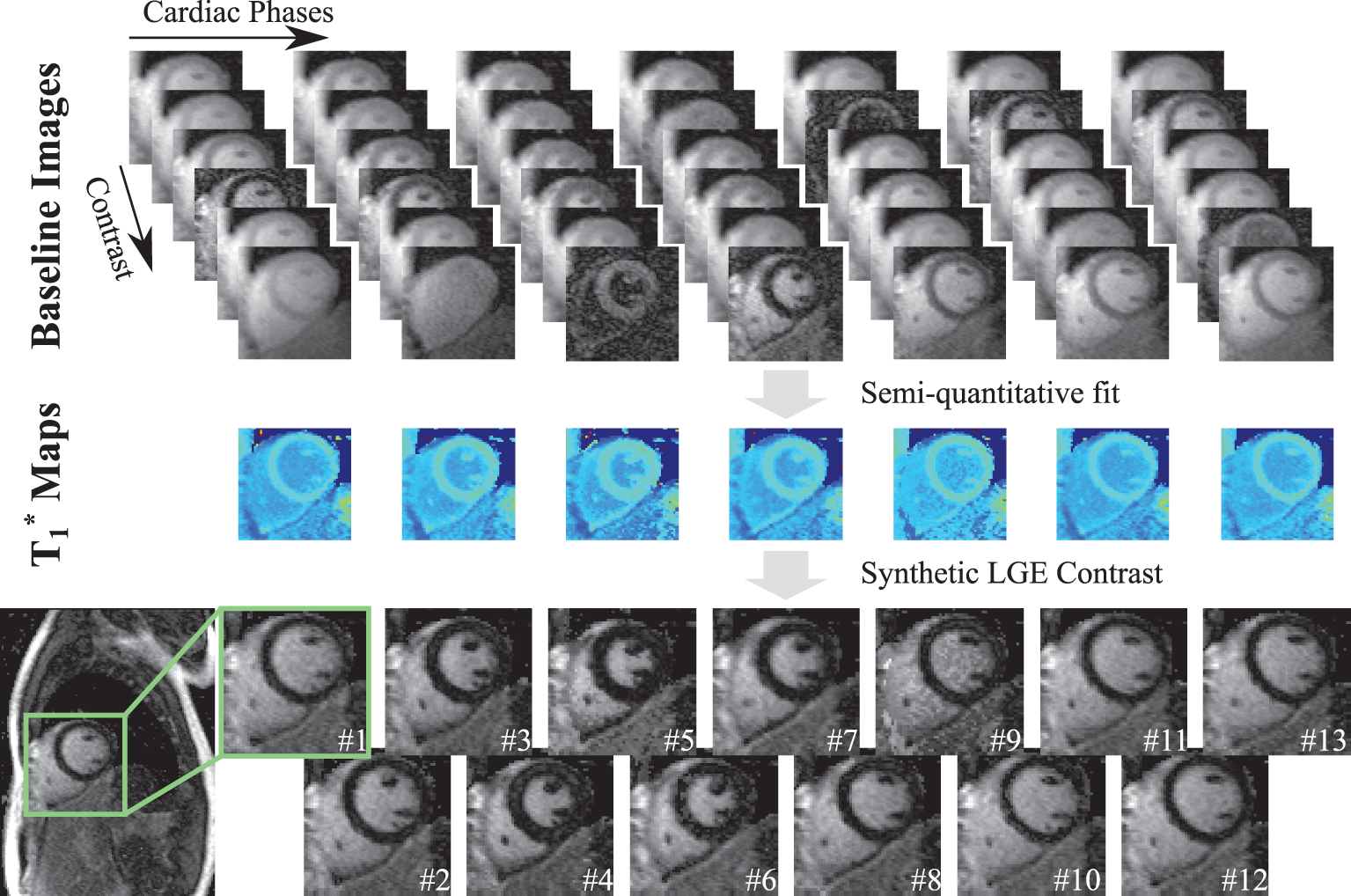 The post-processing pipeline for generating the proposed functional LGE images from the acquired T1-weighted data. For each cardiac phase, the proposed sequence acquires multiple images with different T1 weighting, denoted as Baseline Images. A two-parameter fit is performed on these images to obtain semi-quantitative maps for each cardiac phase. Finally, a virtual inversion time is retrospectively chosen to synthesize functional LGE images for all cardiac phases.