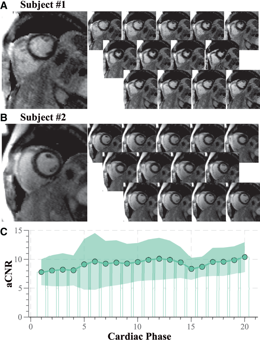 Representative functional LGE images acquired in healthy volunteers at 3T. (A) Subject #1 with heart rate 57 bpm, number of acquisition phases 13, (B) subject #2 heart rate 57 bpm, number of acquisition phases 13. Thorough suppression of the healthy myocardial tissue with sharp delineation against the blood pools is visible for both subjects. (C) Quantitative analysis of aCNR throughout the cardiac cycle across the six healthy volunteers. Moderate variation of the aCNR is obtained across the cardiac phases.