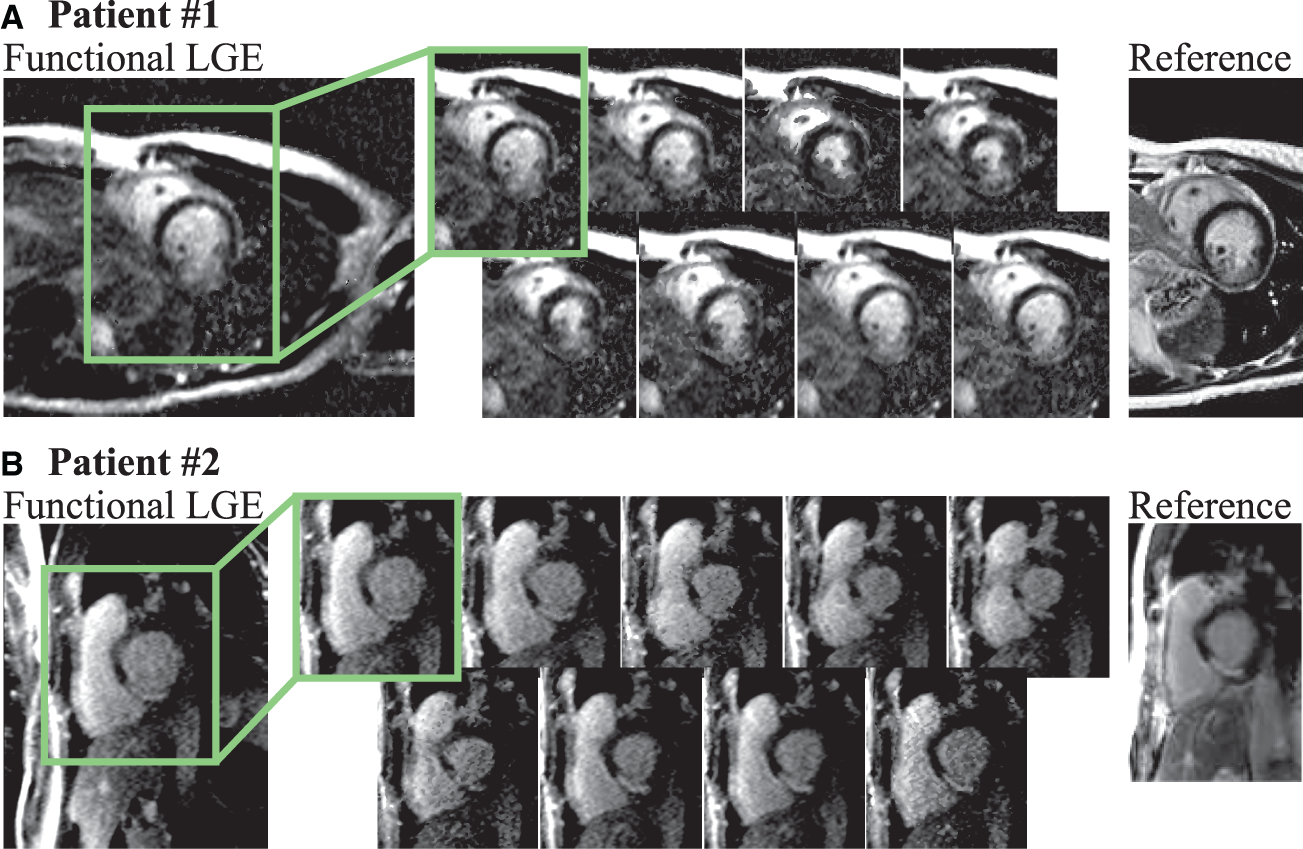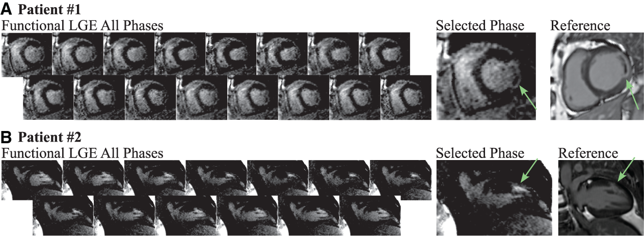 Figure 6B depicts a second CAD patient imaged at 1.5T with 80 ms temporal resolution. Both conventional and the proposed functional LGE methods display scar in the lateral segment. Scar tissue can be visually discerned in all cardiac phases of the functional LGE scan. Thus, scar motility is captured and the displacement can be tracked throughout the heart-beat (Supplementary Video 3). However, a noticeably higher level of imaging noise is observed compared with the clinical reference LGE scan. Furthermore, the noise level appears visually exacerbated in later cardiac phases.