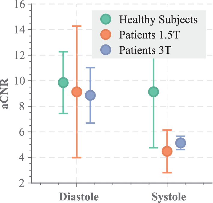 Figure 8 depicts the quantitative comparison of the aCNR across the different cohorts. No significant difference was found for the diastolic phase among the different cohorts (p = 0.90). However, the patient cohorts suffer from substantially lower aCNR in the systolic phase, as compared with the healthy subject data (p < 0.037), suggesting larger variability in the aCNR throughout the cardiac cycle.