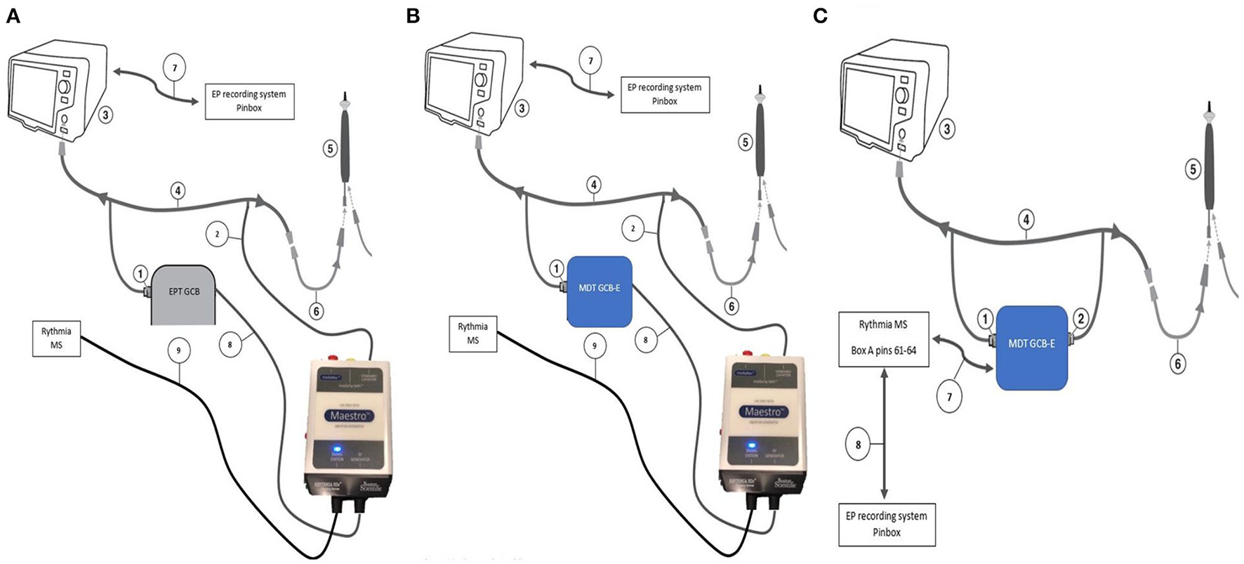 DiamondTemp and Rhythmia connectivity configurations. (A) Setup 3.1. An EPT GCB and Rhythmia Maestro GCB (Maestro GCB, native Rhythmia setup). (1) 14-pin twist connector to RFG via the GCC; (2) 9-pin quick connector to DTC via the GCC to the DTC to RFG cable; (3) DTA RFG; (4) DTA GCC; (5) DTC; (6) DTC to RFG cable; (7) IC out cable; (8) 9-pin quick connector of the Maestro GCB; and (9) Connector from the Maestro GCB to the Rhythmia MS. (B) Setup 3.2. This configuration shows the best accuracy results—The catheter connection is connected to Rhythmia GCB using Genconnect cable and then to MDT GCB as shown in the picture. (1) 14-pin twist connector to RFG via the GCC; (2) 9-pin quick connector to DTC via the GCC to the DTC to RFG cable; (3) DTA RFG; (4) DTA GCC; (5) DTC; (6) DTC to RFG cable; (7) IC out cable; (8) 9-pin quick connector of the Maestro GCB; and (9) Connector from the Maestro GCB to the Rhythmia MS. (C) Setup 3.3. The MDT GCB-E and IC out via the MDT GCB-E directly to the Rhythmia IC in at box 1 (pin A61 to A64) (1) 14-pin twist connector to RFG via the GCC; (2) 9-pin quick connector to DTC via the GCC to the DTC to RFG cable; (3) DTA RFG; (4) DTA GCC; (5) DTC; (6) DTC to RFG cable; (7) IC out cable; and (8)Rhythmia IC out to the EP recording system.