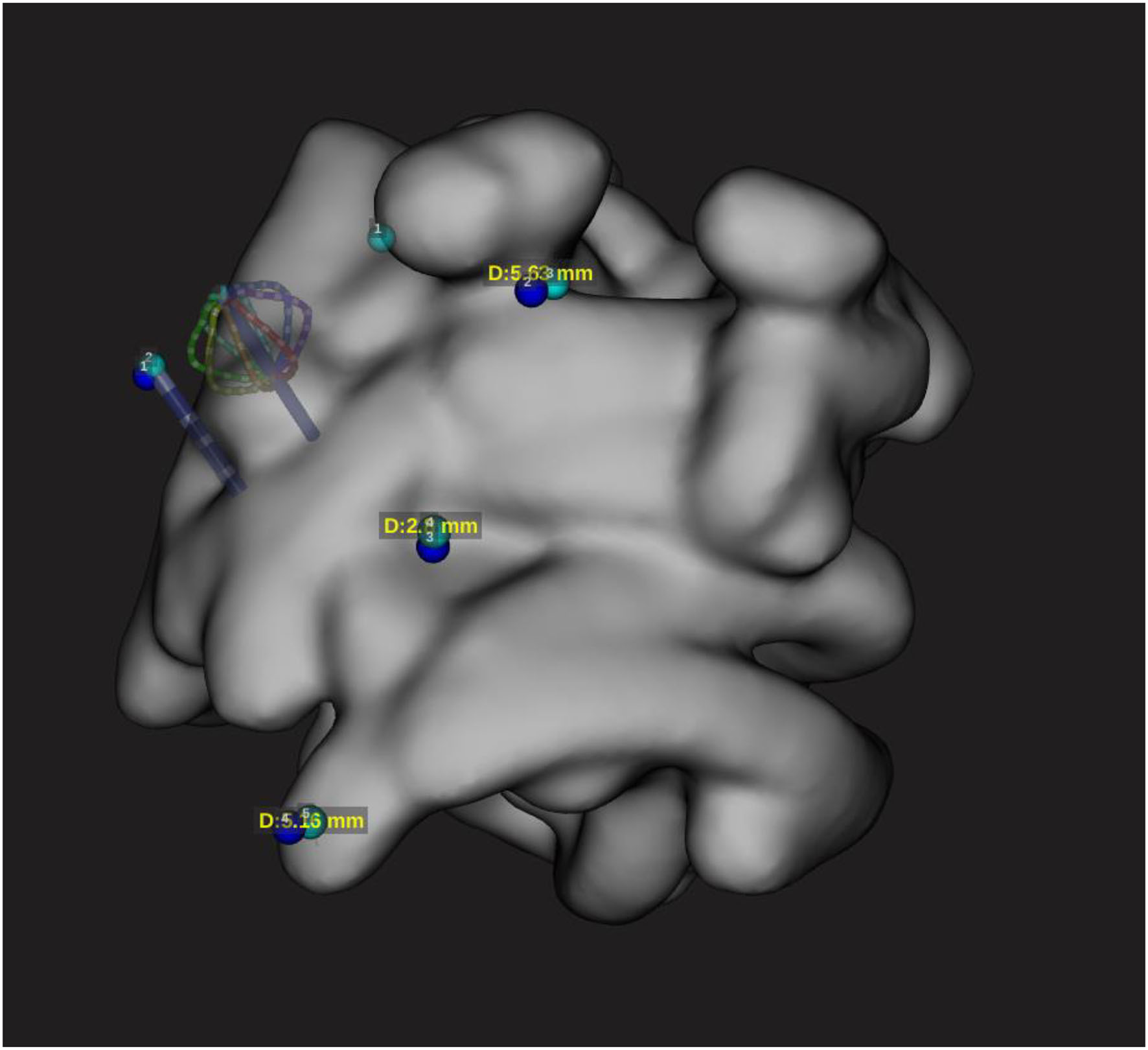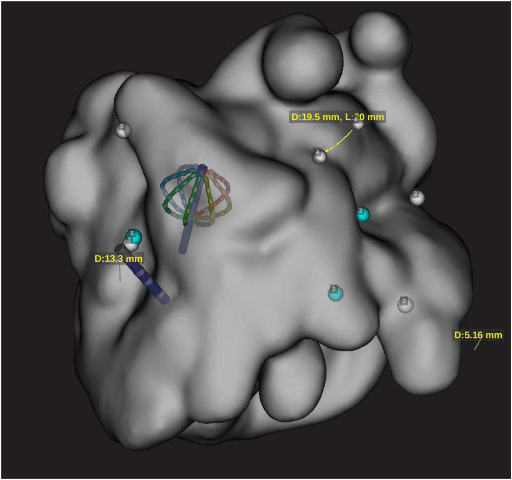 The phantom anatomy was built using a dedicated high-resolution mapping catheter, Intellamap Orion (Boston Scientific). Reference locations from the phantom were reached with the tip of this catheter and the reference locations were added to the surface of the phantom as a baseline. Then the tracking of the DTA was verified by visual comparison of the physical catheter movements and its representation on the map (Figures 3–5).