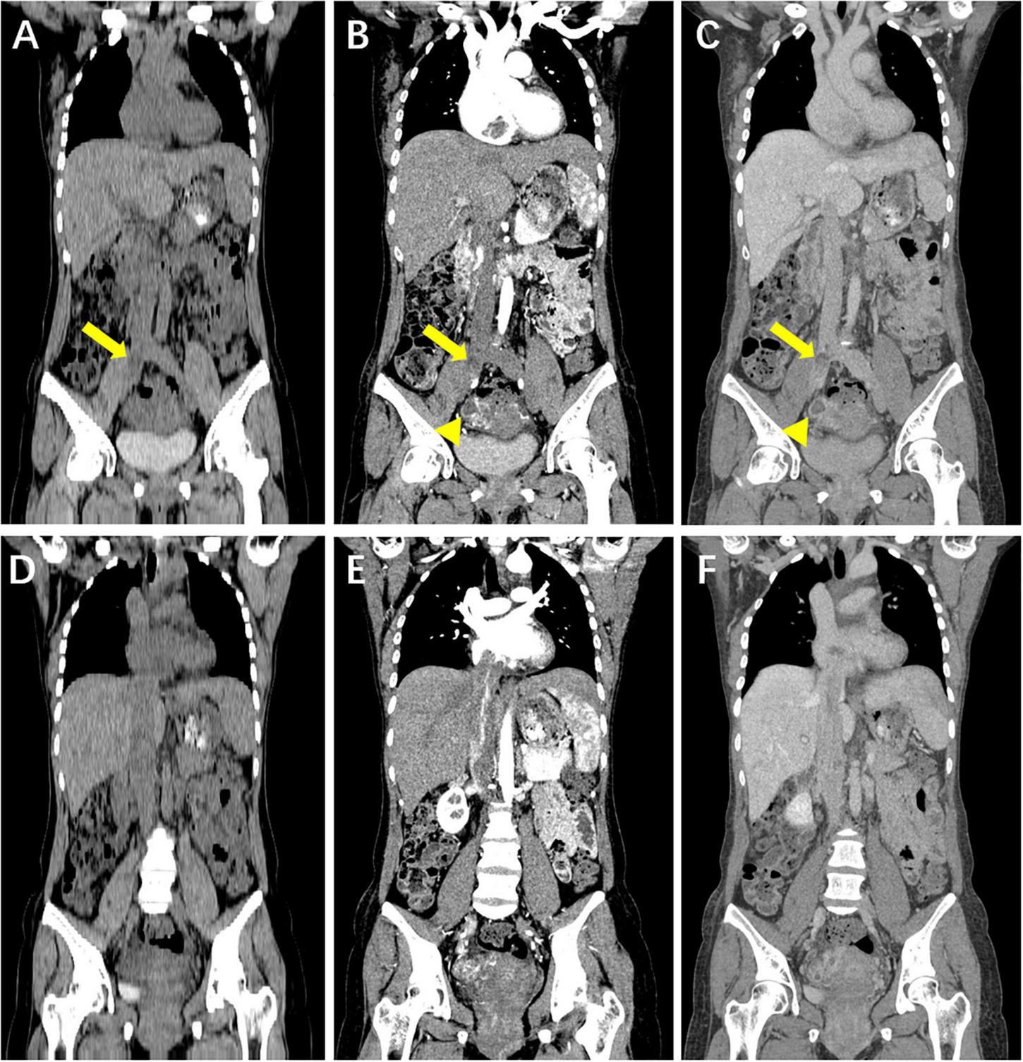 Coronal reformatted computed tomography (CT) image of the chest, abdomen and pelvis. (A–F) Hypoattenuating filling defect located within the right iliac veins across the inferior vena cava (IVC) into the right atrium. Contrast-enhanced CT images show that intravenous lesions demonstrated mainly moderate progressive enhancement, with localized non-enhancing necrotic areas (arrow). A circular enhanced thick-walled cystic lesion at the right of the uterine body is incidentally noted (arrowhead). (A,D) Unenhanced phase image. (B,E) Arterial phase of contrast enhancement image. (C,F) Portal phase of contrast enhancement image.