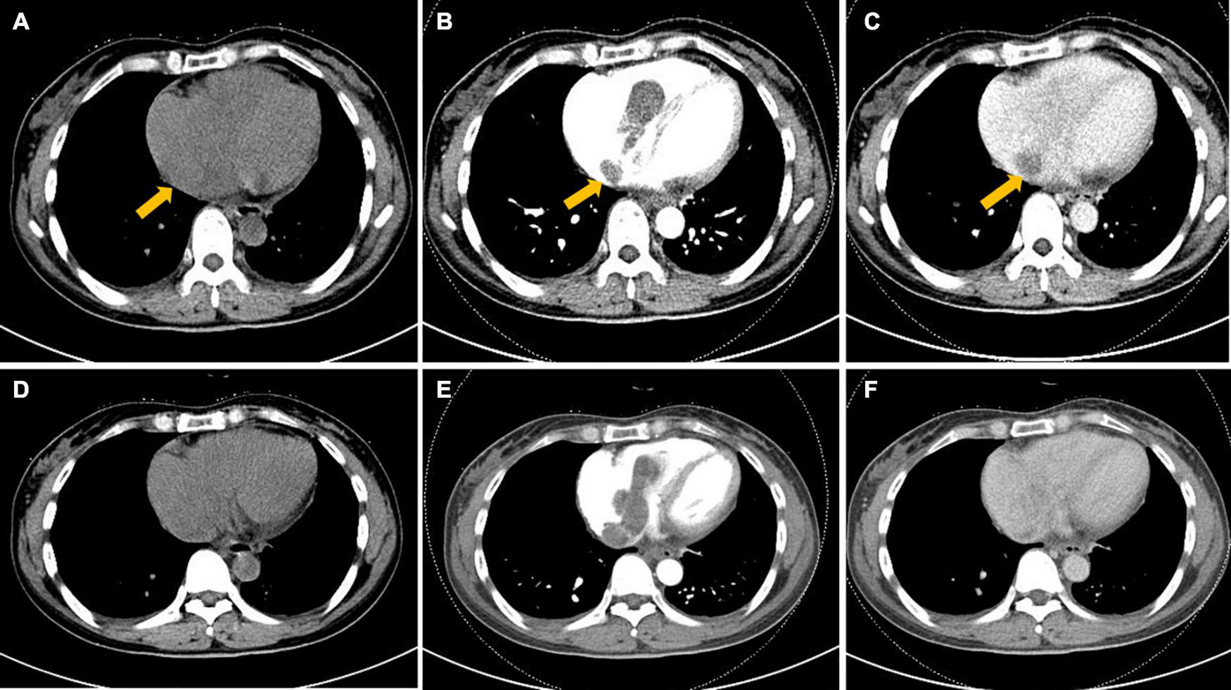 Axial computed tomography (CT) image of the heart. (A–F) Hypoattenuating filling defect located within the right atrium across the tricuspid valve into the right ventricle. Intracardiac lesions demonstrated mainly moderate progressive enhancement, with localized non-enhancing necrotic areas (arrow) on contrast-enhanced CT. (A,D) Unenhanced phase image. (B,E) Arterial phase of contrast enhancement image. (C,F) Portal phase of contrast enhancement image.