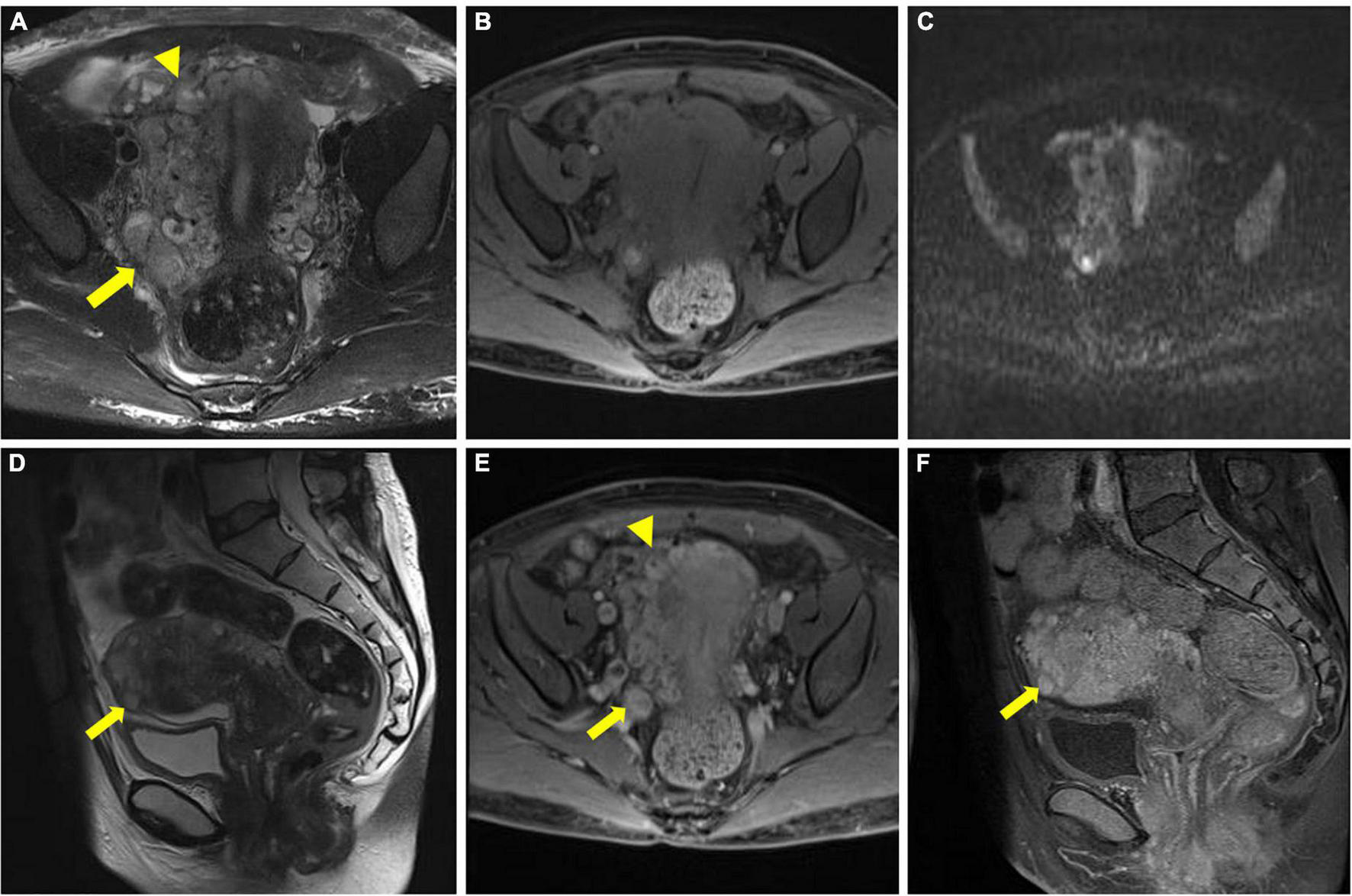 Pelvic magnetic resonance imaging (MRI) image. (A–C) Multiple tortuous and dilated vascular structures at the fundus of the uterus (arrowhead) and the parametrium (arrow). (D) Multiple nodules of varying sizes were observed at the fundus of the uterus (arrow). (E,F) After gadolinium-based contrast material injection, progressively enhanced lesions were noted within the lumen (arrowhead and arrow in E), and the nodules also presented progressive enhancement (arrow in F).